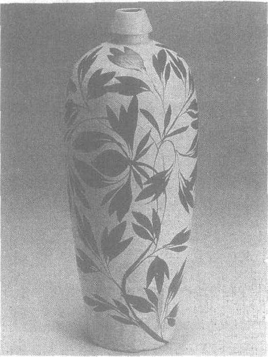 金。高38.3厘米,口径3.4厘米。上海博物馆藏。此瓶为金代磁州窑系制品。该窑系是从宋代沿袭发展而来,当时河南、河北、山西3省的一些瓷窑仿河北邯郸磁州窑产品,逐渐形成一个瓷系,大量生产白地黑花器。用含氧化铁的矿石做绘料,以中国绘画的技法在瓷胚上绘制图案。此牡丹纹瓶为小口,短颈,橄榄形腹,平底。器身绘卷枝牡丹纹,纹饰洒脱自如,黑花白地格外雅致,装饰在这件秀丽规整的瓷瓶上,给人以清丽文静之感。