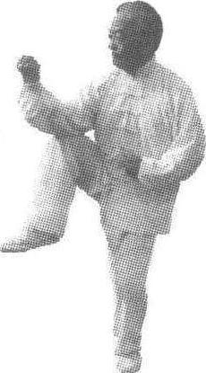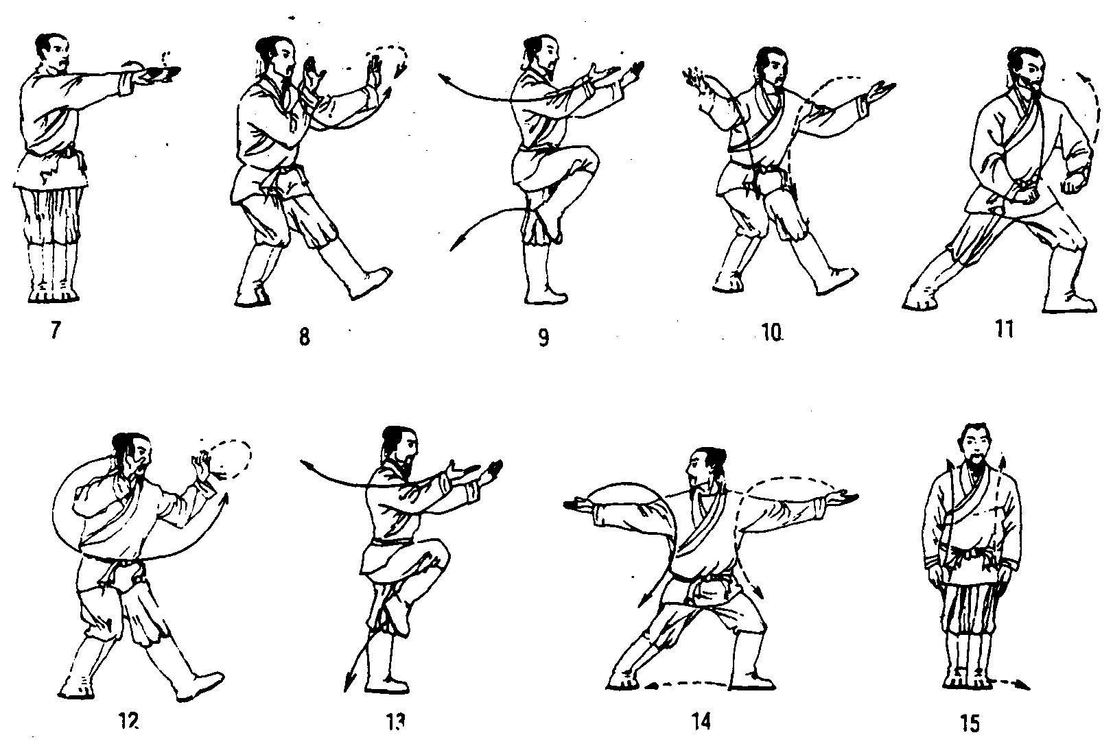 ❽随着呼气,重心移至右脚,右腿稍屈,左脚向右脚并拢,随之两腿伸直,两掌经面前下按成并步站立势。 (图15)第2个8拍同第1个8拍,唯向右前方做动作。练功次数:做两个8拍。要求:意守劳宫;成虚步时松腰敛臀;独立势时五趾抓地,沉肩垂肘,小指微上顶;成弓步时要沉髋;上下肢要协调一致。
