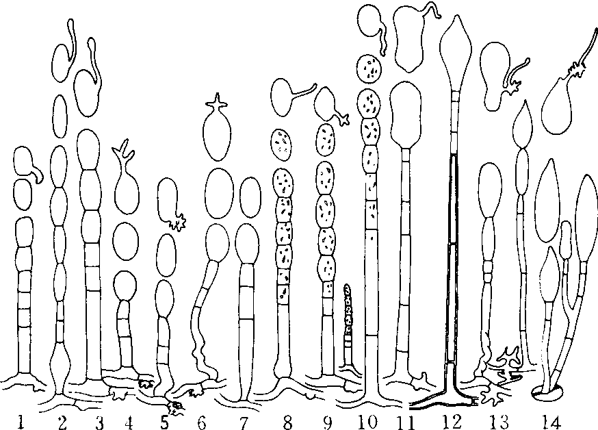 有性态 白粉菌多在生长季节晚期进行有性生殖,形成子囊和子囊孢子于子囊果内。子囊果为闭囊壳类型,多为球形、扁球形或陀螺形;幼时黄色或黄褐色,成熟后深褐色至黑褐色;壁一般由内、外两层组成,厚约数个细胞;无孔口;生于寄主表面的菌丝层上,少数埋生在菌丝层内;表层的一些细胞可发育成附属丝。附属丝有各种形状,是分属的重要依据。子囊球形、卵形、椭圆形、长卵形或棍棒形等;壁双层,有柄或无柄,无侧丝,单个或多个束生或排生于子囊果内。子囊孢子卵形、椭圆形或矩圆形等,2~8个散生于子囊内,单胞,无色或稍带黄色,一般在当年秋末冬初成熟,少数越冬后翌年春才能成熟,通过子囊顶部的开裂而释出。 分类 自1819年沃尔罗思(F.W.Wallroth,1989)和斯里登朵(D.F.L. Schlechtendal)根据附属丝形态和子囊数目提出了他的分类系统,在白粉菌科中包括7属: Erysiphe,Leveillula,Microsphaera,Phyllactinia,Podosphaera,Sphaerotheca和Un-cinula。德国帕拉(E.Palla)1899年根据菌丝的内、外生情况,将白粉菌科分为白粉菌亚科和球针壳亚科;美国萨尔曼(E.S.Salmon)1906年除承认上述两亚科外,还根据拟粉孢属分生孢子梗可分枝的特点又增加了拟粉孢亚科。日本本间(Y.Homma)1937年认同白粉菌科分为上述3亚科。日本胜朝(K.Katumoto)1973年根据离壁壳属气生菌丝上具刚毛和子囊果具两层可剥离的壁而建立了离壁壳亚科。德国布朗(U.Braun)1987年将白粉菌科分为白粉菌亚科和球针壳亚科。白粉菌亚科包括两族: 离壁壳族Cy-stotheceae (含Cystotheca、Sphaerotheca、Podos-phaera)和白粉菌族(Erysipheae)。后者又包括5亚族(Erysiphinae、Microsphaetinae等)。球针壳亚科包括3属(Leveillula、Pleochaeta、Phyllactinia)。 《中国真菌志·白粉菌目》一书中,白粉菌目只含白粉菌科,并在科下直接分属。中国已报道的白粉菌有下列19属: Arthrocladiella,Blumeria,Bulbomi-crophaera,Bulbouncinula,Cystotheca,Erysiphe,Furceuncinula,Leveillula,Medusosphaera,Micros-phaera,Phyllactinia,Pleochaeta,Podosphaera,Sawadaia,Sphaerotheca,Trichocladia,Typhu-tochaeta,Uncinula和Uncinuliella,其中有4个属是由中国人建立的。重要属如下(图2)。 节丝壳属(Arthroclaie lla Vassilkov) 菌丝表生。无性态为粉孢属型。子囊果球形;附属丝极多,顶部双叉或三叉分枝,有的分枝呈节状,子囊多个;子囊孢子无色。单种属,穆氏节丝壳〔A. mougeotii(Leveille) Vassilkov〕引起枸杞白粉病。 布氏白粉菌属(Blumeria Golovin ex Speer)菌丝体表生,具暗色镰形刚毛。吸器佛手状。分生孢子梗基部球形膨大;分生孢子为粉孢属类型。子囊果扁球形;附属丝异常退化,少而短,菌丝状;子囊多个,成束;子囊孢子椭圆形,无色至浅黄色。本属是从白粉菌属分出的。单种属,禾本科布氏白粉菌〔B.grami-nis(de Candolle) Speer〕为害麦类及其它禾本科植物,引起白粉病。 球叉丝壳属(Bulbomicrosphaera A.Q.Wang)菌丝体表生。子囊果球形或扁球形;附属丝直或微弯,顶端双叉分枝多次,基部呈球形;子囊多个,卵形或近卵形;子囊孢子长椭圆形至卵形,无色。单种属,木兰球叉丝壳(B.magnoliae A.Q.Wang)寄生于紫玉米,仅中国有报道。