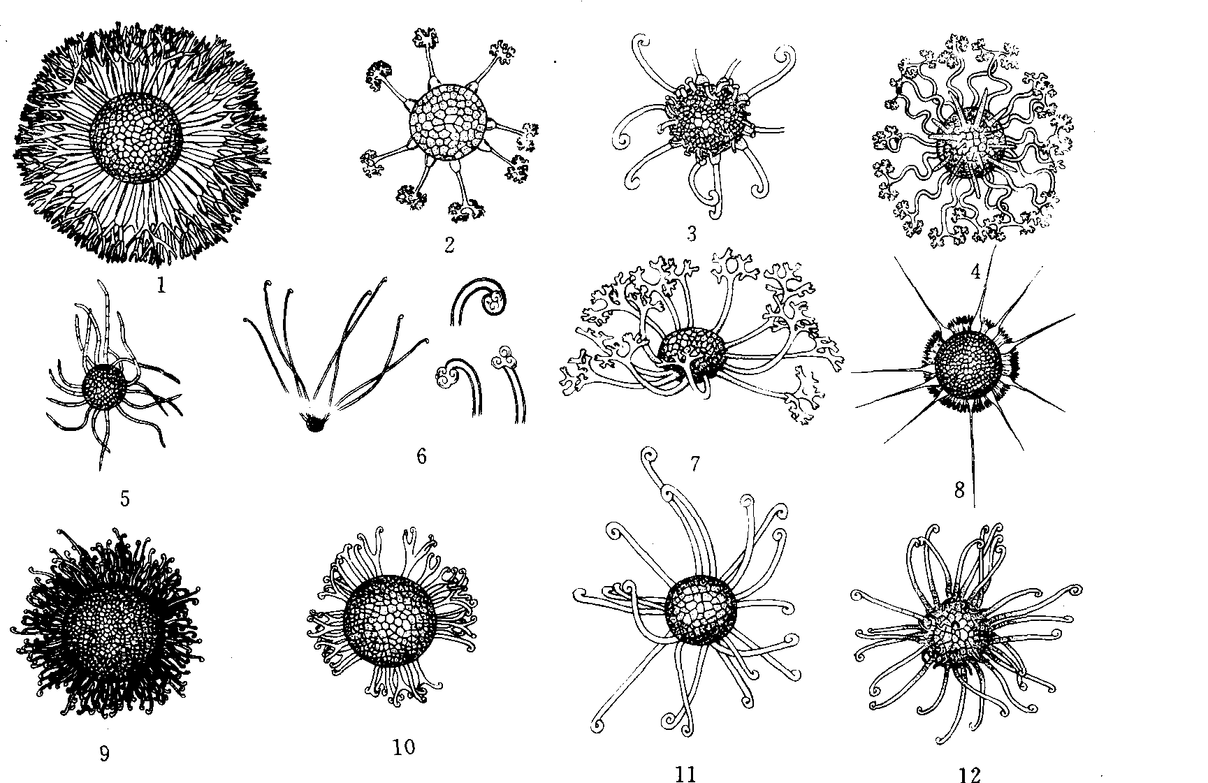 球钩丝壳属(Bulbouncinula Zheng et Chen)菌丝体表生。子囊果扁球形;附属丝两类: 长附属丝具卷旋的顶部和球形的基部;短附属丝蘑菇状;子囊多个,成束;子囊孢子无色。单种属,球钩丝壳〔B.bul-bosa (Tai et Wei) Zheng et Chen〕寄生于栾树,仅中国有报道。 白粉菌属(Erysiphe de Candolle: Fries) 菌丝体表生,吸器形成于寄主表皮细胞内。分生孢子为粉孢属型。子囊果扁球形,有内外壁之分,但互不脱离。附属丝一般菌丝状,简单或不规则分枝,一至数次,子囊多个,成束;子囊孢子无色至浅黄色。全世界约有100种,中国已报道56种,大豆白粉菌(E.glycinesTai)为害大豆等豆科植物。 顶叉钩丝壳属(Furcouncinula Z. X. Chen) 菌丝体表生;吸器形成于寄主表皮细胞内;无性态未详。子囊果扁球形;附属丝顶端卷旋,在钩状部分稍膨大,然后三分叉或双分叉,叉端卷曲,子囊多个,成束;子囊孢子无色。单种属,武夷顶叉钩丝壳(F.wuyiensis Z.X. Chen et Gao)寄生于短尾鹅耳枥,仅中国有报道。 波丝壳属(Medusasphaera Golovin et Gamalitskaya) 菌丝表生,无性态粉孢属型。子囊果球形;附属丝有长短两型: 长型强烈波状弯曲,顶部双叉分枝数次;短型长棒形或圆柱形,直或微弯,表面粗糙、皱缩;子囊多个;子囊孢子无色。单种属,蔷薇波丝壳(M.resae Golovin et Gamalitskaya)仅报道于中国的天山和长白山。 叉丝壳属(Microsphaera Leveille) 菌丝体表生;以吸器透入寄主细胞内。分生孢子粉孢属型。子囊果球形或扁球形;附属丝顶部双叉分枝多次;子囊多个,成束;子囊孢子无色,全世界已报道70余种,中国约45种,中国叉丝壳(M.sinensis Yu)寄生于板栗。 球针壳属(Phyllactinia Leveille) 菌丝体有内、外生两型: 外生菌丝体表生;内生菌丝体由外生菌丝的特殊分枝从寄主气孔进入叶肉细胞并形成吸器、分生孢子为拟小卵孢属型。子囊果扁球形或双凸透镜形;附属丝有长短两型: 长型顶部尖、基部膨大呈球形;短型为无色发亮的帚状细胞;子囊多个;子囊孢子无色或淡色。以往报道全球约10种(大种观点),中国学者对该属的种重新划分已报道35种,香椿球针壳(P. toonae Yu et Lai)引起香椿和楝树白粉病。 半内生钩丝壳属(Pleochaeta Saccardo et Spe-gazzini) 菌丝体半内生,具内生和外生两型菌丝体;吸器形成于内生菌丝。旋梗型属分生孢子生于拟生菌丝上。子囊果侧面观呈陀螺形,较大,附属丝顶端钩状或卷曲,数量多;子囊多个,近成层排列;子囊孢子多椭圆形,无色。全世界约有5种,中国已报道3种,杨生半内生钩丝壳(P. populicola Zhang)引起山杨白粉病。 叉丝单囊壳属(Podosphaera Kunze: Fries)菌丝体表生。分生孢子粉孢属型。子囊果球形或扁球形;附属丝顶部2~6次双叉分枝,具隔,全部或下部褐色或浅褐色,状似叉丝壳属;子囊单个;子囊孢子单胞,无色。全世界约15种,中国有6种,白叉丝单囊壳〔P.leucotricha (Ellis et Everhart) Salmon〕为害苹果和秋子梨等引起白粉病。 叉钩丝壳属(Sawadaia Miyabe) 菌丝体表生;吸器形成于寄主表皮细胞内。无性型为粉孢属型,可形成大小两型分生孢子。子囊果扁球形;附属丝多双叉分枝1~3次,少数三叉分枝,顶端钩状或卷曲;子囊多个,成束;子囊孢子多椭圆形,无色。全世界共6种,中国均有分布,其中半数仅见于中国,梣叶槭叉钩丝壳(S.negundinis Homma)仅分布于中国东北和日本。 单囊壳属(Sphaerotheca Leveile) 菌丝体表生。分生孢子粉孢属型。子囊果球形,附属丝菌丝状,类似白粉菌属,子囊单个;子囊孢子单胞。全世界有42种,中国已报道23种,瓜类单囊壳〔S.cucurbitae(Jaczewskii)Z.Y.Zhao〕为害瓜类引起白粉病。 钩丝壳属(Uncinula Leveille) 菌丝体表生。分生孢子粉孢属型。子囊果扁球形;附属丝简单,一般不分枝,顶端钩状或卷曲一至数圈;子囊多个;子囊孢子无色至淡黄色。《真菌词典》(第7版)仅记载20种,中国已报道约50种,南京钩丝壳(U.nankinsis Tai)寄生于三角枫,是中国菌物学家建立的第一个真菌新种。 小钩丝壳属(Uncinuliella Zheng et Chen) 菌丝体表生;吸器形成于寄生表皮细胞内。分生孢子粉孢属型。子囊果扁球形,附属丝有两型: 长型顶端卷曲或钩状;短型为镰形;子囊多个,子囊孢子无色或浅黄色。全世界约3种,中国均有,枫香小钩丝壳〔U.li-quidam baris (Zheng et Chen) Zheng,Chen et Z.X.Chen)引起枫香白粉病。 白粉菌目Erysiphales子囊菌亚门,核菌纲。菌丝有隔膜。菌丝体繁茂,无色,多数种的菌丝生在寄主体表,少数种有部分菌丝内生在寄主细胞间,以吸器伸入寄主细胞内。吸器多球形或梨形,少数为裂片状或指状深裂。有性生殖时产生扁球形或陀螺形、褐色至深褐色、无孔口的闭囊壳。壳外壁上有多种形状的附属丝:长型附属丝有单枝、二叉至三叉状分枝,呈菌丝状、顶端针状和卷曲状等,有或无隔膜,有或无色;短型附属丝为帚状和棒状等形状。子囊广卵圆形至椭圆形,多个束生或平列,少数种单生,短柄有或无,子囊壁单层。子囊孢子多椭圆形,2~8个,单胞,少数种为双胞或四胞,无色至淡色。无性繁殖时产生分生孢子,单胞,无色,串生或单生在分生孢子梗上。分生孢子着生方式与菌丝生长习性有关:菌丝完全表生的,分生孢子多串生,少数单生如粉孢属(Oidium);菌丝大部分或部分内生的,分生孢子单生,如拟粉孢属(Oidiopsis)和拟小卵孢属(Ovulariopsis)。陆生,专性寄生,危害多种植物叶片、幼果、嫩梢等引致抑制性病变,病部退色或变黄,呈白粉症状。本目仅有白粉菌科,含白粉菌属、球针壳属和叉丝壳属等20余属。 |