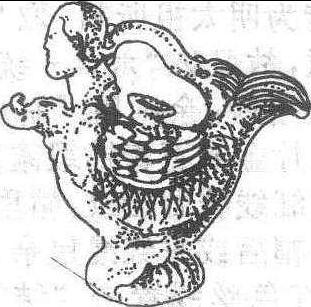 白釉人首鱼龙注壶辽代瓷器。1976年在内蒙古巴林左旗乌兰套海乡出土。高15.3,身长19.3圈足径7—7.7厘米。全为手制,采用贴塑、雕、划等技法,整体造型新颖别致,为前所未见的辽瓷精品。壶前面的少女头像,眉目口鼻毕具,头发结于两侧作髻,垂于耳后;颈、臂间贴饰花朵和飞动式的彩带; 双手扶于胸前,捧持一螭头短柱注。壶身作鱼形,尾鳍上翘,身刻细密鳞片,附体并雕出双翼,脊背部有花冠状注水口,头颈与尾鳍间加曲形提梁。鱼身腹下为圈足,上划竖条纹,并在两侧堆塑出双脚。将人,螭,鱼,鸟的造型组合成一器,维妙维肖,实为罕见。器身全部施白釉,微显黄,圈足内亦大部有釉,釉厚处几乎呈淡棕色。今藏巴林左旗文管所。