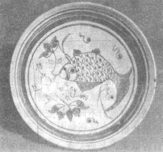 金代瓷器。高六厘米,口径十五厘米。侈口圆唇,腹壁较浅而宽,平底,圈足。胎粗厚,成浅灰褐色。施白釉,釉质粗,呈黄白色。从碗的口沿到碗底部是一圈圈弦纹。红彩为主,间以绿彩,碗心为水和莲花构成的鱼塘图,一条肥鱼,跃然其间。用红彩勾画鱼形,绿彩填绘鱼鳞,配上红花绿叶,颇有民间年画的情调,红绿彩绘,是“宋加彩”的延续,宋代定窑在烧成的瓷器上用色料加以绘画,再经低温烘烤,这样的工艺被称之为“宋加彩”。宋加彩的彩料有红、绿、黄、金、银几种,这是我国瓷器上最早的低温釉上彩。继定窑之后,北方金代磁州窑、扒村窑及山东、山西某些瓷窑竞相烧造。并在一件器物上应用多种彩料。有的器物只用红、绿两色,称作“宋红绿彩”。宋加彩工艺为明、清时期蓬勃发展的五彩、斗彩瓷器开辟了新天地。现藏于山西省博物馆。