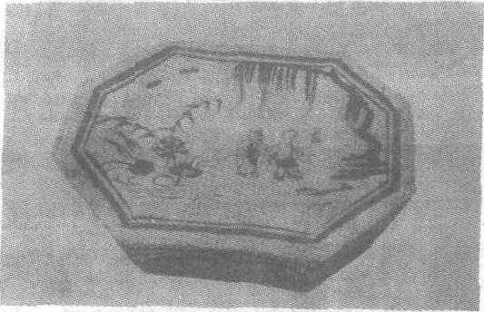 宋。长27厘米,宽20.3厘米。河南省鹤壁市博物馆藏。瓷枕呈八角形,正面两边较长,施白釉,几个侧面均绘黑色卷草纹。枕面依枕形而绘的黑色双框中绘莲池图一幅,池中水波道道,荷花盛开,芦苇轻摇,一双蝴蝶翩翩而至,飞舞在莲荷之上。垂柳下,有两个儿童玩耍后正欲离去,其一手持莲蓬,另一举荷叶,满脸稚气,流露出欢快尽兴。全图布局平衡,意境清幽,乡野气息和孩童的稚趣表达完美,用笔简淡明快,流畅活泼,为瓷枕增添了饶有生趣的艺术色彩。