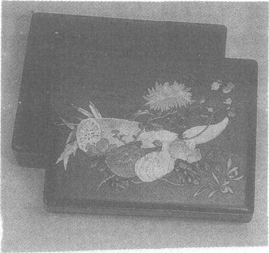 清乾隆。长27.5厘米,宽22厘米,高6厘米。北京故宫博物院藏。圆角长方形,子母口,盒与盖口沿处各描一圈回纹,盖面用白玉、螺钿、孔雀石、碧玉、红玛瑙等嵌以团簇一起的藕、莲蓬、菊花、芙蓉、兰花、石榴、竹叶等花果,疏落有致,柔和多姿。此图微凸如浮雕,花、果各依其色,设色协调,形态逼真,堪称百宝嵌中的珍品。百宝嵌,又名“周制”,是漆器镶嵌的一种方法。采用金银、宝石、珍珠、螺钿、象牙等珍贵材料雕成山水、人物、亭台楼阁、花卉等图案镶嵌于漆器、檀及梨木等器上面。