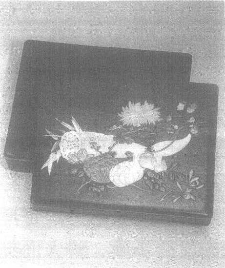 这种利用高档材料在漆木器上拼嵌图案的技法,在明清时被称作 “百宝嵌”。其实它起源很早,汉代可能已有,唐代文献中常见的“宝钿”大约也同它有关。唐代中期,屡禁宝钿,这种技法一度失传。明嘉靖时(一说为明末),周翥(或做周柱)又开始了百宝嵌的制作,他以金银珠宝、珊瑚象牙、贝壳沉香等在漆木家具、容器上镶嵌各种图案。这些材料色泽、质地各异,若配合巧妙,能使形象极其生动自然。如此盒的藕身用白玉,而剖开的断面则用贝壳,莲蓬用碧玉,菊叶用孔雀石,兰花用青玉,红果用玛瑙,维妙维肖地表现了不同物象,甚至同一物象的不同部位的不同色泽与质感。百宝嵌的图案有的微微隐起,有的表面平齐,嵌在此盒上的图案即属前一类。百宝嵌又因明清时创始者的姓氏,称作“周制”、“周嵌”。产地只在扬州 一处。传世的百宝嵌作品不多,这不仅因为它制作较少,还因为它易遭毁坏。因其所镶嵌材料大多高贵,奸商往往挖去原嵌,易以他物。