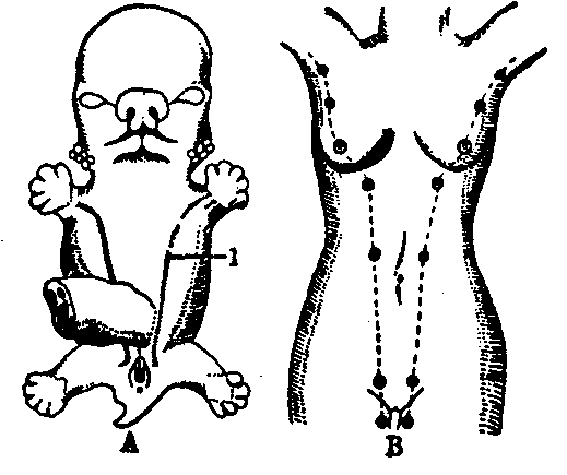 乳腺的发生 乳腺为哺乳类的特征之一。在妊娠第6周,可见从上、下肢芽间体壁的左、右腹侧出现两条对称的表皮增厚嵴带,这就是乳腺嵴,或叫做乳线,雌、雄俩性相同,上自腋窝,下达腹股沟区。但在人类只胸部小段将来发育成乳腺,其余部位均行退化。啮齿动物和肉食动物等沿乳线全长的若干点发育出左、右两排乳腺,有蹄动物则只有乳腺的腹股部得到发育。联系种系发生的事实,可以理解人在正常乳腺位置以外偶见副乳腺发生的现象(见图)。