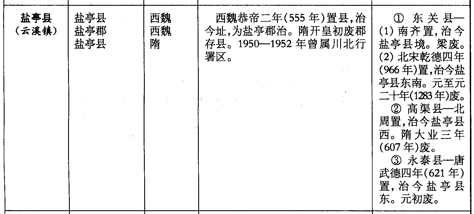 盐亭县(云溪镇)盐亭县盐亭郡盐亭县西魏西魏隋西魏恭帝二年(555年)置县,治今址,为盐亭郡治。隋开皇初废郡存县。1950—1952年曾属川北行署区。❶ 东关县—(1)南齐置,治今盐亭县境。梁废。(2)北宋乾德四年(966年)置,治今盐亭县东南。元至元二十年(1283年)废。❷ 高渠县—北周置,治今盐亭县西。隋大业三年(607年)废。❸ 永泰县—唐武德四年(621年)置,治今盐亭县东。元初废。