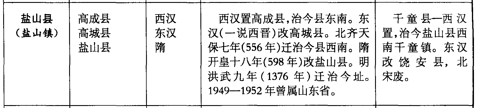 盐山县(盐山镇)高成县高城县盐山县西汉东汉隋西汉置高成县,治今县东南。东汉(一说西晋)改高城县。北齐天保七年(556年)迁治今县西南。隋开皇十八年(598年)改盐山县。明洪武九年(1376年)迁治今址。1949—1952年曾属山东省。千童县—西汉置,治今盐山县西南千童镇。东汉改饶安县,北宋废。