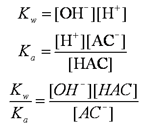 释义 | 盐水解的计算 盐水解的计算yan shuijie de jisuan盐的离子与水电离出的H+或OH-作用生成弱酸、弱碱的反应叫盐的水解。此溶液中除了有水的电离平衡外还存在着第二个电离平衡(弱酸或弱碱)。具体计算按3种盐进行: AC-+H2O Kh是盐水解达平衡的常数,称水解常数,其大小与水的离子积常数和酸的解离常数有关。由 此公式可计算弱酸强碱盐水解的pH值。例如,醋酸的电离常数Ka=1.76×10-5,0.025mol·L-1的NaAc溶液pH为: ❷ 强酸弱碱盐水解 如浓度为c盐的NH4Cl盐水解: Ka=Kb pH=7 溶液呈中性 Ka>Kb pH<7 溶液呈酸性 Ka NH4AC溶液呈中性是由于HAC的Ka=1.76×10-5,NH3·H2O的Kb=1.79×10-5,二者几乎相等,pH=7。但它与强酸强碱盐pH=7有本质的不同。 将以上3种盐水解的计算公式归纳如下: 另外,对于多元弱酸盐,如Na2CO3,水解时呈碱性,水解是分步进行的,而第一步水解远大于第二步水解,所以计算时均以第一步水解为主。多元弱碱盐,如Al2(SO4)3,水解也是分步进行的,以第一步水解为主,第二、第三步水解较困难。它们水解产生的酸性主要来自第一步水解,产物还会有沉淀析出。 盐水解时除计算其溶液的pH之外,还可计算水解度,即盐水解的百分率,用h表示。 ☚ 电离常数的计算 缓冲溶液的计算 ☛ |