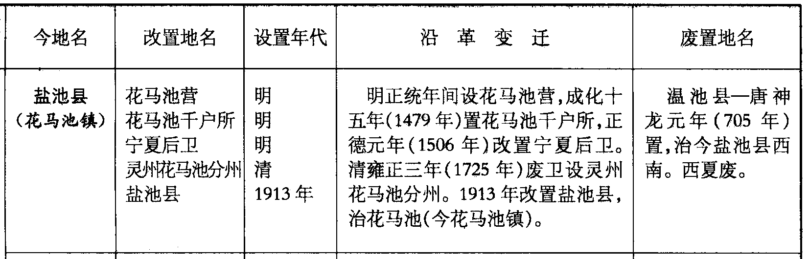 盐池县(花马池镇)花马池营花马池千户所宁夏后卫灵州花马池分州盐池县明明明清1913年明正统年间设花马池营,成化十五年(1479年)置花马池千户所,正德元年(1506年)改置宁夏后卫。清雍正三年(1725年)废卫设灵州花马池分州。1913年改置盐池县,治花马池(今花马池镇)。温池县—唐神龙元年(705年)置,治今盐池县西南。西夏废。