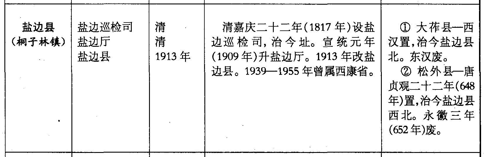 盐边县(桐子林镇)盐边巡检司盐边厅盐边县清清1913年清嘉庆二十二年(1817年)设盐边巡检司,治今址。宣统元年(1909年)升盐边厅。1913年改盐边县。1939—1955年曾属西康省。❶ 大莋县—西汉置,治今盐边县北。东汉废。❷ 松外县—唐贞观二十二年(648年)置,治今盐边县西北。永徽三年(652年)废。