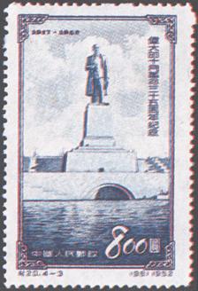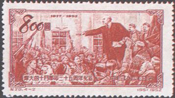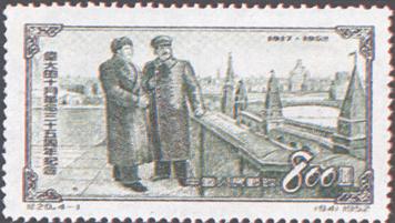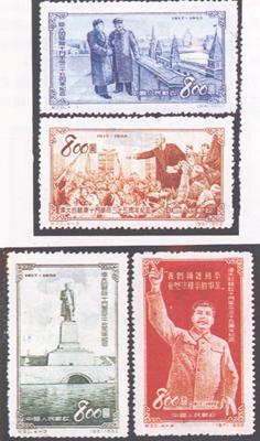 发行日期:1953年10月5日 齿孔度数:14 印刷版别:雕刻版 图幅:(1)(2)42×22.5;(3)(4)24×41.5 全张枚数:(1)(2)84(7×12);(3)(4)84(12×7) 设计者:孙传哲 雕刻者:刘国桐 印刷:北京人民印刷厂营业分厂     (1)800元 中苏友好 600万枚 (2)800元 十月革命 600万枚 (3)800元 共产主义建设 500万枚 (4)800元 斯大林演说 700万枚 (1)-(4) 4枚全 纪20 伟大的苏联十月革命三十五周年纪念 (误印票 未正式发行)  注:原定1952年11月7日发行纪念伟大的十月革命三十五周年邮票,已印就发至各局,后因票名误印,通知停止发行。但湖南省等有一部分邮局出售使用。 |