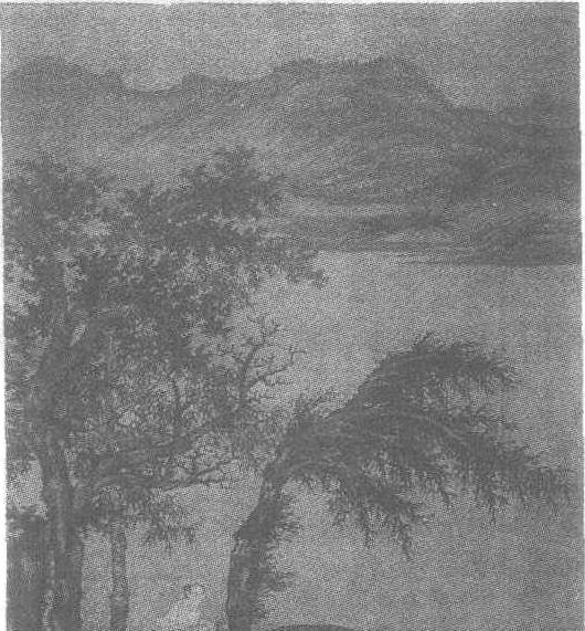 元。盛懋(见《盛懋秋江待渡图轴》条目)绘。绢本设色。纵167.5厘米,横102.4厘米。上海博物馆藏。此图表现秋江水色。岸边古木参天,枝繁叶茂,树下坡头幽暗晦冥,苔草丛生。江风劲吹,树梢与水中的芦苇都向右侧倾倒。江水宽阔,一驾小舟顺流而下,船尾有一小童摇橹,船头一位高士盘坐酒瓮之旁,衣袍宽松凌乱,双手反撑于手,酒兴大发,仰天长啸。远处山峦起伏,灌木疏散点缀其上。图中逸士很可能就是魏晋时期号称“竹林七贤”之一的阮籍。史载阮籍志气宏放而愤世嫉俗,在司马氏执掌朝纲的政治高压下,不得已放浪于山林水泽之间,往往长醉不醒,并借清啸之声抒发内心的苦闷。此图笔墨有独到之处,舟船人物用笔极为工细,浅着色,取法唐人,生动传神。坡石树草俱以水墨为之,师学董源、巨然,行笔松动,表现了江南山水温润葱茏的特色。此图将粗放与工整,设色与水墨结合起来。无作者款印,曾经明内府收藏。