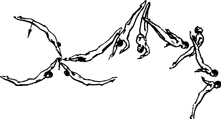 是吊环下法类中一个高难度下法,亦称直体“旋”下。它是在直体后空翻两周下的基础上加做转体360°的又一高难下法。它在80年代中后期才有少数几个高级运动员在自选动作中选用。1989年和1993年版国际体操规则定为D组难度动作。由于它的翻转半径较之团身或屈体“旋”的翻转半径要大,因此较好完成这一动作也就更难。它要求空翻高度更高,而且空翻两周多采用“直、挺”式技术来完成。即,空翻第1周直体且略收髋;第2周快速向后抬头、挺身以减小翻转半径,加快翻转速度,以有利于动作的完成。在掌握了直体后空翻两周下和直体后空翻转体360°下的基础上就可以试做这个动作了。因为这时它所必须的空翻高度、转体的概念以及所需要的转体速度通过以上2个动作的练习已经得到较好地解决。它在前摆兜腿放手之后空翻第1周翻转至头朝下时再开始做转体,原来的略收髋迅速把身体伸展绷直,保证较好的转体的纵轴,有利于加快转体。这时梗头、收颏、快速左转,右臂屈肘快速向左肩挥摆,左臂屈肘置于胸前。在完成第1周后空翻的同时完成转体360°;接着快速抬头,用力向后挺身,成稍反弓形,以减小翻转半径,加快翻转速度。待第2周空翻翻转至头朝下时,举腿收髋,立腰提气,准备缓冲落地,完成动作。