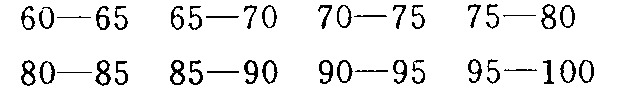 整理时,可按照下列步骤进行: ❶明确数据的变动范围:在上面数据中,最大值是100,最小值是60,它们的差是100-60=40, 由此知道这组数据的变动范围为40。 ❷决定组距与组数:将一组数据分成小组,一般来说,数据越多,分的小组数也越多。当数据在100以内时,一般分成5-12个小组。组距是指每个小组两个端点之间的距离。本例中, 可以取组距为5, 根据 ![]() 按组距为5, 将数据分成8个小组: ![]() ❹列出频数分布表: