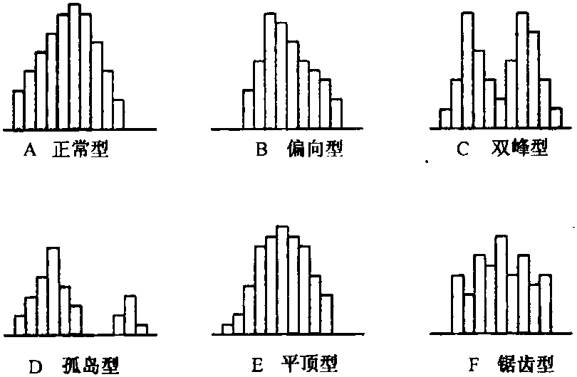 为了将频数分布表中的结果直观形象地表示出来, 一般要绘出频数直方图。如图 ![]() 图中横轴表示分数,纵轴表示频数。其中小长方形 ![]() 形的面积等于相应的各组的频率。频率直方图是以图形面积的形式反映了数据落在各组的频率的大小。 ☚ 频数与频率 算术平均数 ☛ 直方图histogram使用直方长条连续组合的面积代表数量的总和,以每直方长条代表各分组的数量。绘制方法是以纵轴代表频数,从0点开始,以横轴代表分组,组距可以等距,也可以不等距,每直方长条的数量是以组距与长条长变相乘来代表,用以确定直方长条的长度。各直方长条累积起来便构成直方图,用来代表总数量的分布。直方图可以说明有连续性计量资料的频数分布状况。 直方图亦称“频数直方图”,在质量管理工作中又称“质量分布图”。以抽样所得数据为依据,将质量特性值的分布情况,按照数据出现的频率而绘制成的一种图解。其作法是:按数据的大小顺序进行整理,将其范围划分为若干个区间,统计各区内数据的个数,以区间为底,区间内数据个数为高,画成一系列矩形的图。通常情况下,质量分布图是中间高,左右离得越远越低,并大致对称,形成正态分布。它用于估计生产中可能出现的废品率,分析判断工艺过程,产品质量稳定情况。如实际质量特性数值分布范围在质量指标范围之内,则是理想的生产状况,如果平均值偏离中央和分布范围超出允许范围之外,则表明出现了次品,产生了异常因素,应分析其原因,采取改进措施。一般的直方图的形式如下图。 直方图亦称“分配直方图”。用条形表现分配数列的图形。此种图形主要特点是条形之间没有间隔,最适于表示分配数列中连续变量数列,是表现分组资料的最普遍的一种图形。在产品质量管理中称为质量分布图,从中可见产品质量分布状况。 直方图 直方图histogram亦称“分配直方图”。用条形表现分配数列的图形。此种图形主要特点是条形之间没有间隔,最适于表示分配数列中连续变量数列,是表现分组资料的最普遍的一种图形。在产品质量管理中称为质量分布图,从中可见产品质量分布状况。 ☚ 次数曲线图 分配直方图 ☛ 直方图 直方图Histogram展示数据分布状况的一种直观的图形工具,也称为频数直方图。以所研究的数据作为横轴,将数据分为若干个区间,以各个区间中所含数据的频数作为纵轴,如此便形成了由一系列宽度相等(表示数据分组的区间),高度各异(表示在给定间隔内的数据数)的长方形所构成的直方形的图形。 图9-8 常见的直方图类型 ☚ 分层法 控制图 ☛ 直方图 直方图主要用来反映组距式连续型变量数列或组距式离散型变量数列。 ☚ 条形图 圆形图 ☛ 直方图 直方图亦称“质量分布图”、“矩形图”、“柱状图”、“频数图”。将产品质量特性值的分布情况用一系列直方形表示,以探索质量特性分布规律,分析判断生产过程是否正常的一种图解。直方图的作法是,以抽样所测得的数据为依据,通过计算确定组距、组数,以及各组的上、下边界值,并分组进行统计,计算各组数据频数,整理出频数分布表,然后按表中数据绘制直方图。直方图的横座标为组号或代表尺寸,纵座标为零件数或频数,并以频数为高、组距为底,绘出一系列的矩形,便得到频数直方图。如下图所示: 频数直方图 画直方图的目的是通过观察分析其形状和位置来判断生产过程是否稳定和预测生产过程的不良品率。一般可从两方面进行: (1) 分析直方图的形状是否正常。正常的直方图一般符合正态分布规律,除此之外的锯齿型、孤岛型、偏向型、陡壁型、双峰型和平顶型等,均属异常,表明生产过程有问题,应查明原因加以解决。(2) 将直方图的位置与质量标准对比分析,主要观察直方图分布中心与公差中心的重合程度,将分布范围与公差范围进行比较。如果分布中心与公差中心偏移过大,应查明原因予以调整。如果分布范围超过公差范围,则表明工序能力过小,已经出现不合格品,应进行全数检查,把不合格品挑出来。 ☚ 散布图法 控制图 ☛ 直方图histogram |