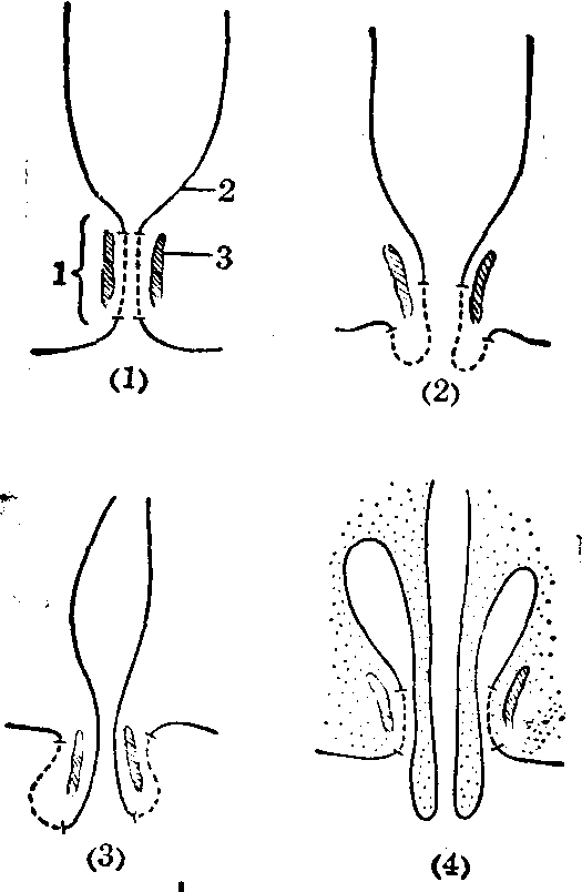直肠脱垂 (1)正常肛管直肠 (2)粘膜脱垂 (3)完全脱垂 (4)盆结肠套叠脱垂 1.肛管 2.粘膜 3.肌层(内括约肌)
