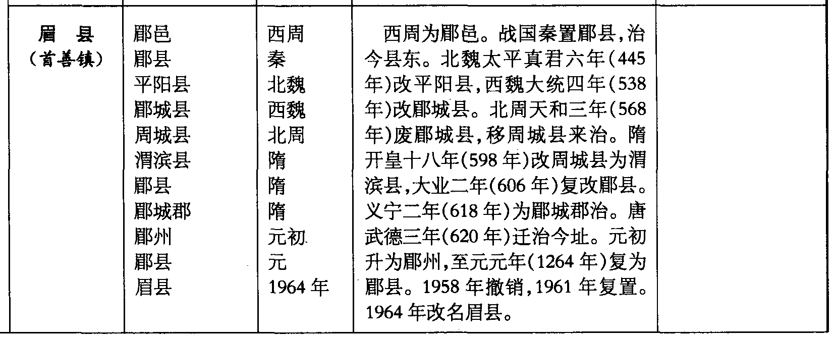 眉县(首善镇)郿邑郿县平阳县郿城县周城县渭滨县郿县郿城郡郿州郿县眉县西周秦北魏西魏北周隋隋隋元初元1964年西周为郿邑。战国秦置郿县,治今县东。北魏太平真君六年(445年)改平阳县,西魏大统四年(538年)改郿城县。北周天和三年(568年)废郿城县,移周城县来治。隋开皇十八年(598年)改周城县为渭滨县,大业二年(606年)复改郿县。义宁二年(618年)为郿城郡治。唐武德三年(620年)迁治今址。元初升为郿州,至元元年(1264年)复为郿县。1958年撤销,1961年复置。1964年改名眉县。