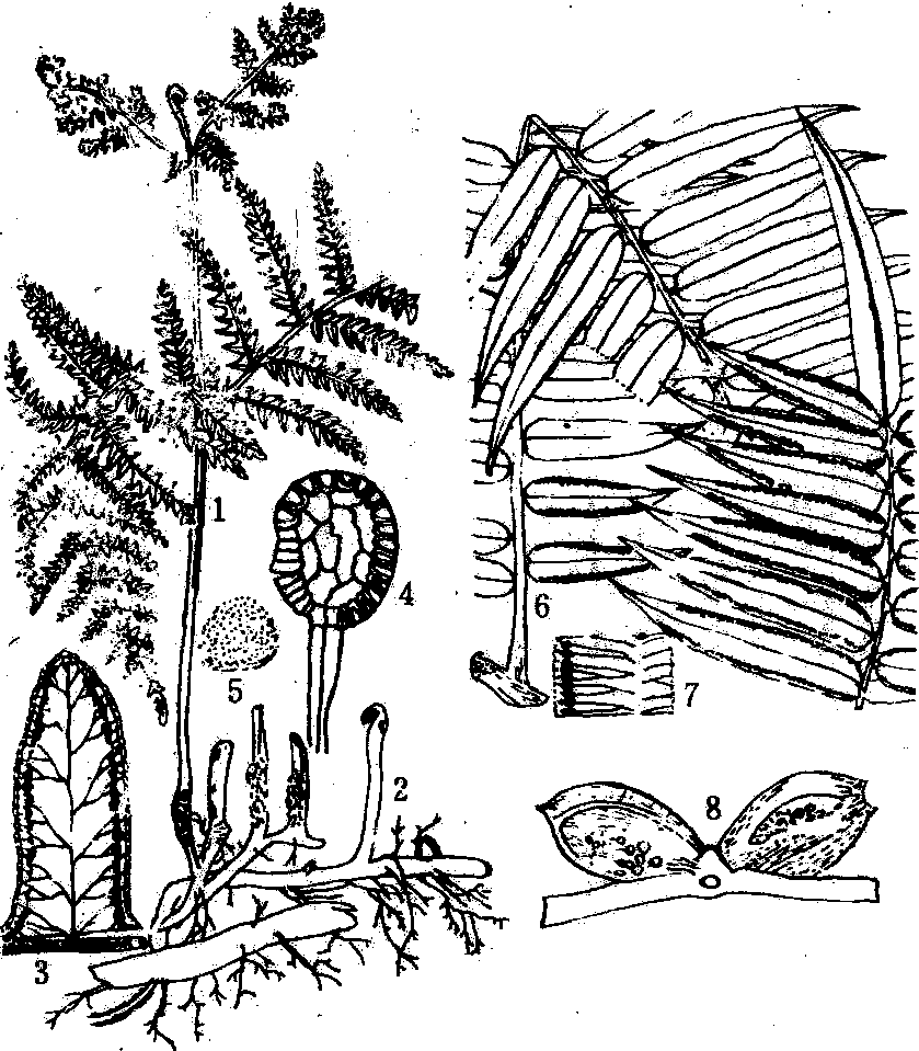 释义 | 真蕨纲Pteropsida幼叶拳卷和大型叶的一类古老维管孢子植物。在史前时代已是地球上的优势植物。至古生代末期,许多已绝迹,但在中生代和新生代却有大量的新种出现。近代研究表明,某些蕨类今天仍在继续进化中,是蕨类植物中的一个大纲。秦仁昌1987年将现存的真蕨隶属为真蕨亚门(Filico-phytina),下分3个纲:厚囊蕨纲(Eusporangiopsida),包括瓶尔小草目(Ophioglossales)和观音座莲目(Ma-rattiales); 原始薄囊蕨纲 (Protolyptosporangiopsi-da),包括紫萁蕨目(Osmundales); 薄囊蕨纲(Lepto-sporangiopsida),包括水龙骨目(Polypodiales)或真蕨目(Filicales)、蘋目(Marsileales)和槐叶蘋目 (Sal-viniales)。约1万余种,广布全球。中国约56科,2 500余种,广布全国各地。多数为土壤生、附生或飘浮水生,生于森林生境或岩石上,甚至生于荒漠和冻原。约1/3的种类分布于热带。 真 蕨 纲 1~5. 蕨: 1. 孢子体; 2. 幼叶;3. 羽片背面观,示囊群盖;4. 孢子囊; 5. 孢子;6~8. 福建莲座蕨; 6. 叶之一部分;7. 羽片一部分,示边缘孢子囊群; 8. 孢子囊 孢子体发达,有根、茎、叶的分化。茎明显树干状(桫椤科Cyatheaceae),或多为直立和匍匐根状茎,有原生、管状和多环中柱,但幼龄孢子体通常为原生中柱。多数真蕨木质部仅含管胞,少数有导管 (蕨属Pteridium)。体外常有多种鳞片或毛。幼叶拳卷。叶为有叶隙的大型叶,单叶或一至多回羽状分裂或复叶,叶轴上的小叶称羽片,羽轴上的小叶称小羽片,叶脉单一、羽状、分叉或网结。少数叶片无限生长(海金沙属Lygodium)。孢子囊生于叶背、叶缘或特化孢子叶上,绝大多数种类常于孢子叶背面聚集成各种形状的孢子囊群,或满布叶背面,有或无囊群盖。原始类型的孢子囊为多层细胞,无环带,如观音座莲目。进化类型的壁薄,仅一层细胞,有环带,如真蕨目。少数为异型孢子(蘋目和槐叶蘋目),多数为同型孢子。配子体发育均为孢子外发育型,配子体有丝状 (莎草蕨属Schizaea)、带状(膜蕨属Hymenophyllium)、块状(紫萁属Osmunda)。或为小的扁平心形叶状体,绿色,腹面有假根。雌雄同株。精子器成熟在颈卵器之前,精子有鞭毛。 真蕨纲fern; Filicopside现代最繁盛的大型叶蕨类植物。孢子体有根、茎、叶的分化,内部形成维管系统。叶大型,远较茎发达。孢子囊生于叶下面(远轴面)或边缘,集成孢子囊穗、孢子囊群,或生在特化的孢子囊果内。现代真蕨约有1.4万种,产于世界各地。中国有2000种以上,广泛分布于全国各省区。许多种类与生产和经济有密切的关系。(见“蕨类植物”) |