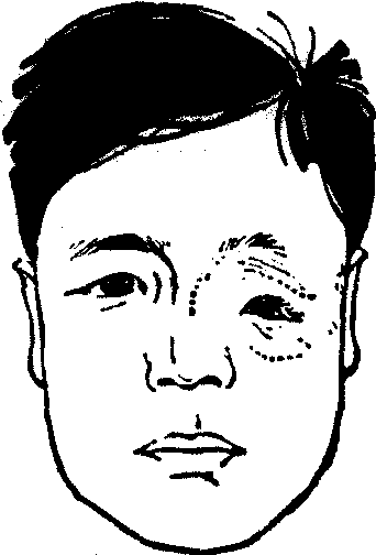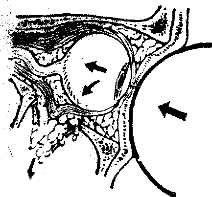 释义 | 眶底骨折后遗畸形 眶底骨折后遗畸形眶底系由上颌骨、颧骨、泪骨等共同组成的较薄弱骨壁。眶缘则骨质较厚而坚强。当眼部为弧面直径大于5cm的钝器,如球类或拳头击中时,眼球及其他眶内容物迅速向较狭小的眶窝后部移动,眶内压力突然急剧增加,致使眶底的最薄弱部位破裂发生骨折,称为眶底爆裂骨折(图1)。眶缘可以并无损伤,眼球受眶缘坚强骨架的保护,可能尚较完好。伤后,如在1周内未能及时作出正确诊断,进行适当治疗,如开放整复,将坠入上颌窦内的组织还纳入眶内,经下鼻道用碘仿纱条填塞上颌窦等措施。则2周后,即可因组织错位愈合而呈现眶底骨折后遗畸形。 图1 眶底爆裂骨折的发生机理 眶底骨折后遗畸形,主要表现为眼球的内陷和向下移位。这是由于眶内脂肪组织经由眶底的骨折裂缝向上颌窦内脱垂,眶底塌陷,以及眼球受嵌入骨折部眼肌的向后下方牵拉等因素所造成。眼球内陷显著时,还可以出现上睑假性下垂、上睑睑板上凹陷增深、睑裂横径缩短等畸形(图2)。 图2 眶底骨折后遗畸形 功能障碍,表现为复视。主要系由于包括下直肌、下斜肌,还有韧带、筋膜和骨膜等软组织嵌入眶底裂缝,肌肉活动受到牵制所致;也或因下直肌、下斜肌等肌肉的神经损伤,肌肉瘫痪,同样可以导致上下眼外肌肌力的平衡失调,眼球的转动受到妨碍,造成视轴偏斜,而出现复视。手术治疗原则,为经眼睑皮肤或结膜切口,或经犬牙窝部的上颌窦切开,或兼由经睑和经口两种经路,充分显露眶底。彻底解脱嵌顿的组织,以恢复眼外肌肌力的平衡和眼球的自由转动。还纳疝入上颌窦内的眶内脂肪组织,并修复眶底,封闭眶窝与上颌窦间的通路,以恢复原眶窝的正常容积和形状,消除眼球内陷。眶底的修复,可行髂骨移植。儿童可用劈裂肋骨移植法,植入眶底的骨膜之下。局部上颌窦粘膜常有缺损,但可上皮化自行愈合,逐渐将移植骨的骨面覆盖。还可用肋软骨或组织代用品修补眶底缺损。 ☚ 眼窝狭窄、闭锁 先天性小耳 ☛ |