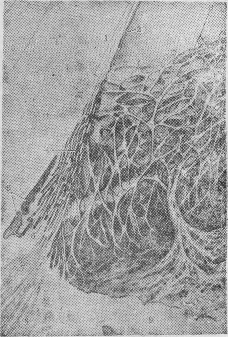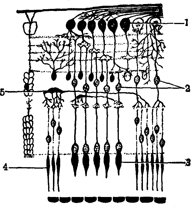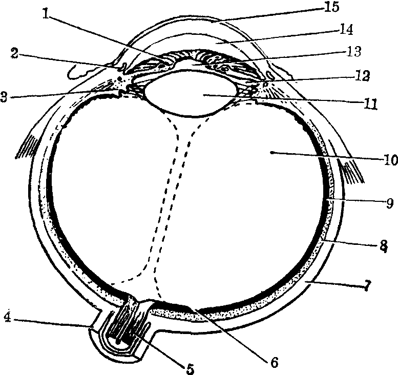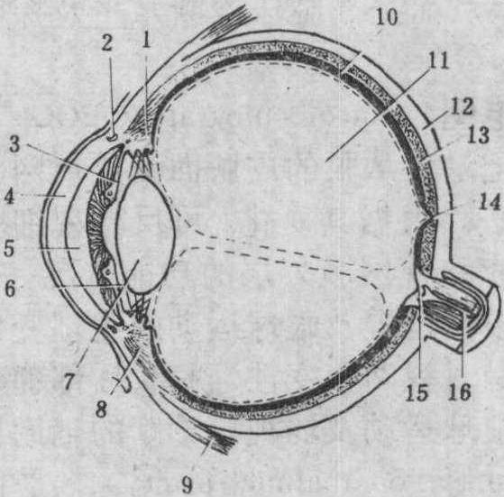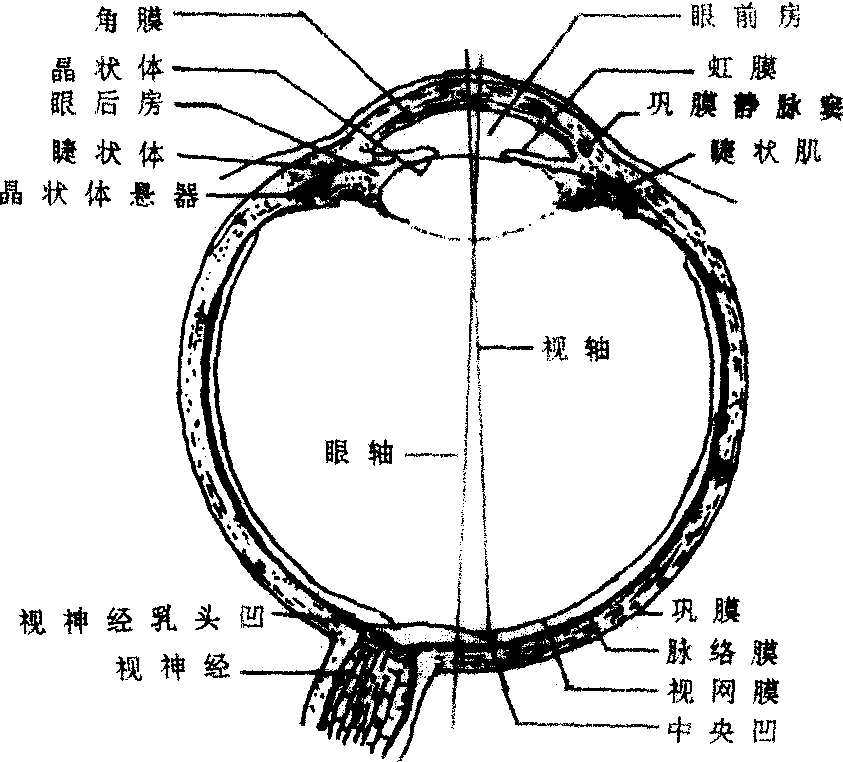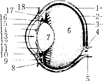 释义 | 眼球yǎnqiú❶视觉器官的主体部分。人的眼球呈球状,藏在眼眶内。俗称眼珠子。 眼球yǎnqiú〈名〉 借指注意力。 眼球yǎnqiú〈名〉借指注意力。 眼球yǎnqiú〈名〉借指注意力。 眼球yǎn qiú眼的主要组成部分。通称眼珠子。1851年合信《全体新论·脑为全体之主论》:“第二对入眼球,司观万物。”1873年丁韪良等《中西闻见录》第16号:“每在婴幼时,恒视近物而自不觉其不便,即至童年,读书写字之际,方得籍镜以佐之。倘其弊太深,则无论远近之物,视瞻均皆不清,此乃生成眼目折光之弊,太约由眼球之形势不同而然者也。” 眼球 眼球yǎnqiú借指注意力。 ☚ 眼库 眼线 ☛ 眼珠 眼珠睛(目睛) 眹(目眹) 眼球 眼黑 眼精 眼仁 瞳人 目珠 ☚ 眼的各部 眉毛 ☛ 眼球bulbus oculi视觉器官具有感光作用的主要部分,由三层眼球壁及折光系统构成。眼球壁外层为纤维膜,前部约1/4部分完全透明称角膜,后部3/4为白色不透明的巩膜。中层为血管膜,分为脉络膜、睫状体和虹膜三部分。虹膜位于晶状体前方,中央有瞳孔。内层为视网膜,能接受光的刺激,产生光觉和色觉。折光系统有水状液、晶状体和玻璃体3种。水状液为无色透明的液体,位于眼房(角膜与晶状体的间隙,又被虹膜分为眼前房与眼后房,经瞳孔相通)内。晶状体为无色透明、有弹性的双凸体,与睫状肌相连,借肌肉收缩来调节其曲度。玻璃体为无色透明的胶状体,位于晶状体与视网膜之间。 眼球纵切面 1. 巩膜 2.脉络膜 3.视网膜 4.视乳头 5.视神经 6.玻璃体 7.晶状体 8. 睫状突 9.睫状肌 10.晶状体悬韧带 11.虹膜 12.角膜 13.瞳孔 14.虹膜粒 15.眼前房 16.眼后房 17.巩膜静脉窦 18. 球结膜 眼球眼球的外形近似球体,前后径最长约24 mm,水平径居中约23.5 mm,垂直径最短约23 mm,眼球经线圆周的长度约74.91 mm。眼球的容积,新生儿平均为2.8 mL,6个月内婴儿平均为5.25 mL,成人平均为6.8~7.5 mL。瞳孔的大小,新生儿2~2.5 mm,幼儿4 mm,儿童4~5 mm,青春期3~4 mm,40~50岁3~3.5 mm,50~60岁2~3 mm,60~90岁2~2.5 mm。不同光线下成人瞳孔直径,晴天昼光2~4 mm,中度照明3~4 mm,暗处7.5~9.6 mm。眼动脉压,收缩压8.0~10.7 kPa(60~80 mmHg),舒张压4.0~5.3 kPa(30~40 mmHg)。 眼球 眼球yanqiu视觉器官的主要部分。外形似球状,位于眼眶前半部,后端由视神经直接连于间脑。眼球由眼球壁和内部的折光装置组成。眼球壁包括外膜、中膜、内膜三层。(1) 外膜: 是纤维性膜,由致密结缔组织构成,具保护作用。前部1/6为角膜,凸而透明。角膜内无血管,其营养来自角膜缘外侧的血管网及房水。角膜富有神经末梢,感觉敏锐,外膜的后5/6为白色不透明的巩膜。(2)中膜: 又称血管膜,呈棕色,紧贴巩膜内面,是含丰富血管和色素细胞的疏松结缔组织膜。营养眼内组织,吸收眼内分散的光线,有利视网膜的光色感应。中膜从前向后可分为虹膜、睫状体和脉络膜三部分。虹膜呈圆盘状,中央有瞳孔,位于角膜和晶状体之间,其颜色因含色素的多少和分布而异。中国人的虹膜多呈棕色。虹膜内含有两种平滑肌纤维,一种为瞳孔开大肌,在瞳孔周围,呈放射状排列,受交感神经支配,收缩时瞳孔开大; 另一种为瞳孔括约肌,环绕瞳孔周围受副交感神经支配,收缩时使瞳孔缩小。睫状体为虹膜后外方的环形增厚部分,内有平滑肌称睫状肌,受副交感神经支配,通过睫状肌的收缩或舒张可调节晶状体的曲度。睫状体向后移行为脉络膜,占中膜的2/3。膜内含有血管和色素细胞,有营养和遮光的作用。(3) 内膜或视网膜: 分为两部分,紧贴在脉络膜内面的有感光作用,称视网膜视部; 紧贴于虹膜和睫状体内面的无感光机能,称视网膜盲部。在视网膜后部有一圆形隆起是视神经乳头或称视神经盘。此处无感光能力,称生理性盲点。在视神经乳头颞侧3、5毫米处,有 一淡黄色的小区称黄斑。其中央凹处是感光最敏锐的部分。视网膜的微细结构很复杂,外层为色素上皮层,内层为高度分化的神经组织层。细胞通过复杂的突触联系,在视网膜中传递和初步加工视觉信息。整个视网膜的全部神经节细胞的轴突集中穿出眼球构成视神经。眼的折光物质包括角膜、房水、晶状体和玻璃体,它们共同组成眼球的折光系统。房水是充满眼房内的透明水状液,由睫状体上皮细胞分泌形成。房水在眼房内不断地循环更新,对角膜、晶状体具有营养和带走代谢废物的作用,还能保持一定的眼内压。房水循环受阻,房水量积集过多,则引起眼内压升高,影响视力,即为青光眼。晶状体是无色透明富有弹性的折光体,由多层晶状纤维构成。晶状体曲度改变的能力,随年龄的增长而减弱。此外,睫状肌的紧张程度,也会影响晶状体的曲度。青少年时期,若用眼不当,使晶状体曲度增加,且 一时得不到恢复,久之,将会形成近视眼。晶状体发生混浊,影响视力,称为白内障。玻璃体是无色透明的胶状物,填充于晶状体和视网膜之间,对视网膜具有支撑作用。 图498 眼球的结构(水平切面模式图) ☚ 眼 眼睑 ☛ 眼球eyeball系视器的主要部分。位于眶内,其后方借视神经与脑相连。眼球大致为球形,前面的正中点叫前极,后面的正中点叫后极。在两极间的中点,沿眼球横轴所作的环线,叫中纬线。通过前、后极间的轴叫眼轴。通过瞳孔的中央至视网膜的中央凹,叫做视线。眼球与视线作锐角交叉。眼球由被膜(外膜、中膜和内膜)和折光部分(房水、晶状体和玻璃体)所组成,眼球的疾病较多。可发生各种