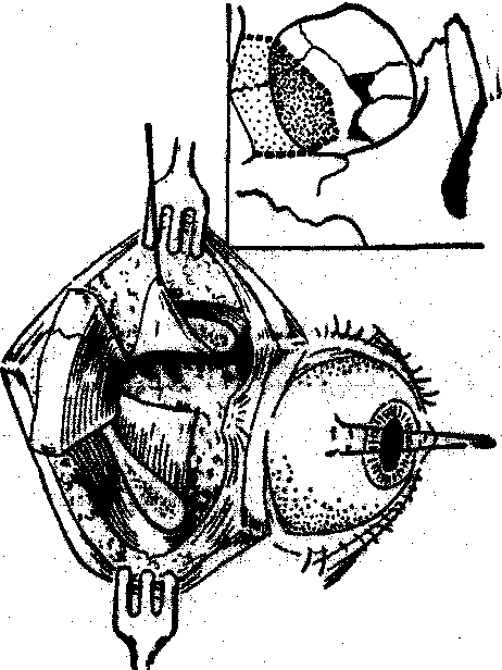 眶侧壁切开术 亦称Kronlein-Berke手术,适用于眶深部及肌锥内肿瘤,此手术可以稍离外眦角外开始向颞侧作一3~4cm长切口,或沿外侧眶缘作弧形切口,向外眦韧带作标志线并切断韧带,沿眶缘切开骨膜,并循眶壁向后方充分分离骨膜。另在颧骨面上分别齐平上、下眶缘直线切开骨膜至颞窝处,再用凿或电锯依骨膜切线切断外侧眶壁,切口须稍斜向眶内,以便将来使眶骨容易复位。用咬骨钳扭断眶外侧壁使骨片向外翻转,垂直切开已分离的外侧眶骨膜,找到肿瘤,加以分离取出,然后,依次缝合眶骨膜,使眶骨片复位、缝合外眦韧带及颧骨面骨膜及皮肤切口,加压包扎。