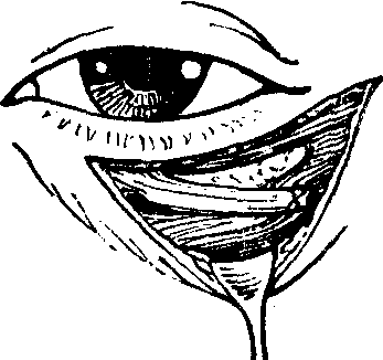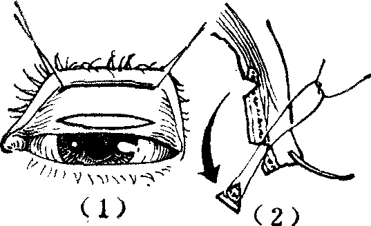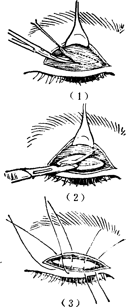 释义 | 眼睑内翻 眼睑内翻眼睑内翻为睑缘向眼内卷转畸形。眼睑内翻后睫毛方向随之转向眼内,称为倒睫。睫毛磨损角膜,引起刺痛、流泪。久之,可因角膜损伤而影响视力,甚至失明。眼睑内翻有原发性和继发性两类。可单发于上睑或下睑。上睑内翻的后果较下睑内翻为严重。 图1 眼轮匝肌肌瓣紧缩缝合术矫治退行性眼睑内翻 (4) 睑结膜或结膜下瘢痕,如睑球粘连,以及最常见的因砂眼所引起的瘢痕性睑内翻。睑球粘连时的内翻,睑缘正常,治疗时应设法将粘连分离松解,内翻即可随之获得矫正。砂眼等所致瘢痕性内翻,睑缘多有变形。治疗可视内翻程度的轻重选用适当方法。程度轻微者,可将向眼球倾倒的局部睫毛行电解脱毛术去除。程度严重者,睑板组织增厚,并呈凹面过度向内的弯曲弧面变形时,可行Hotz手术,或睑结膜睑板楔状复合组织游离移植术矫治才可望收效。 Hotz手术,适用于上睑瘢痕性内翻。手术原则,为顺沿相当正常睑缘上皱襞部位所作切口,根据内翻程度的轻重,在切口上缘切除一块宽度适当的梭形皮肤及位于其底层的眼轮匝肌(图2 (1))。显露睑板,用锐刀将增厚的睑板组织削薄(图2(2))。缝合时,由创口近睑缘侧皮肤引入缝线,穿连睑板前层组织,再从另侧创缘牵出缝线。缝线暂勿结扎,俟缝合完毕,再一一收紧打结(图2 (3))。缝合后,可使睑缘区皮肤与睑板愈着,并将睑缘向外翻转。缝合时穿连睑板的位置愈高,则向外翻转的作用愈强。如原为单眼皮,术后可出现双眼皮。 图2 Hotz手术矫治上睑瘢痕性内翻 睑结膜睑板楔状复合组织游离移植术矫治内翻,用于上睑。手术原则,为在暂时保持上睑向外翻转的情况下。于接近睑板上缘部位,切取宽约2mm 的楔状睑结膜睑板复合组织片,创面任其自愈。再沿睑缘紧靠向内倒转的睫毛后方作与睑缘平行但向上呈45°角倾斜的切口,以防损伤睫毛的毛囊毛根。将所取楔状睑结膜睑板复合组织片嵌植于睑缘切口内缝合固定(图3)。 图3 睑结膜睑板楔状复合组织游离移植矫治上睑瘢痕性内翻 ☚ 眼睑外翻 眼睑松垂症 ☛ |
