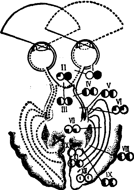 图中视路系统损害的部位用罗马数字表示。Ⅰ示视神经损害:视野呈同侧盲。Ⅱ示视神经与视交叉连接部损害: 视野呈同侧盲和对侧颞上象限盲。Ⅲ示视交叉正中部损害: 视野呈双颞侧偏盲。Ⅳ示视束损害: 显示显著不一致性同侧偏盲。Ⅴ示视束近心部、外侧膝状体或视放射下部损害: 视野呈清晰的同侧偏盲不伴黄斑回避。Ⅵ示视放射前襻损害: 视野呈不一致性上象限盲。Ⅶ示视放射上部损害: 视野呈轻度不一致性下象限盲。Ⅷ示视放射中部损害: 视野呈轻度不一致性同侧偏盲不伴黄斑回避。Ⅸ示视放射后部损害: 视野呈一致性同侧偏盲伴黄斑回避。Ⅹ示距状裂皮质前部受损: 视野呈对侧眼的颞侧新月形盲。Ⅺ示距状裂皮质中部损害: 视野呈一致性同侧偏盲伴黄斑回避和对侧眼的颞侧新月形回避盲。Ⅻ示枕叶皮质后部损害: 视野呈一致性同侧偏盲性中心暗点。