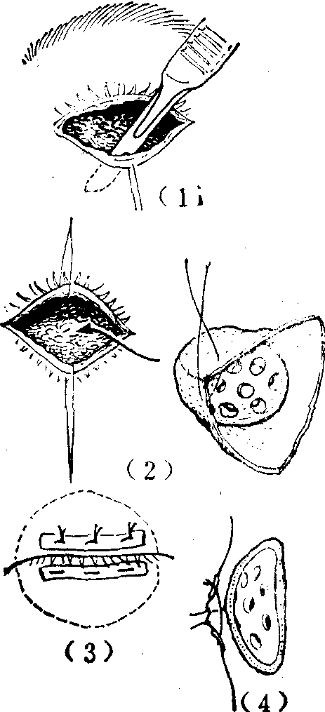 (1) 切开剥离形成腔穴;(2)用皮片底层朝外包裹有孔假眼模型植入剥出腔穴的内嵌植皮术; (3)睑缝合术;(4)内嵌植皮术和睑缝合术的纵断面。