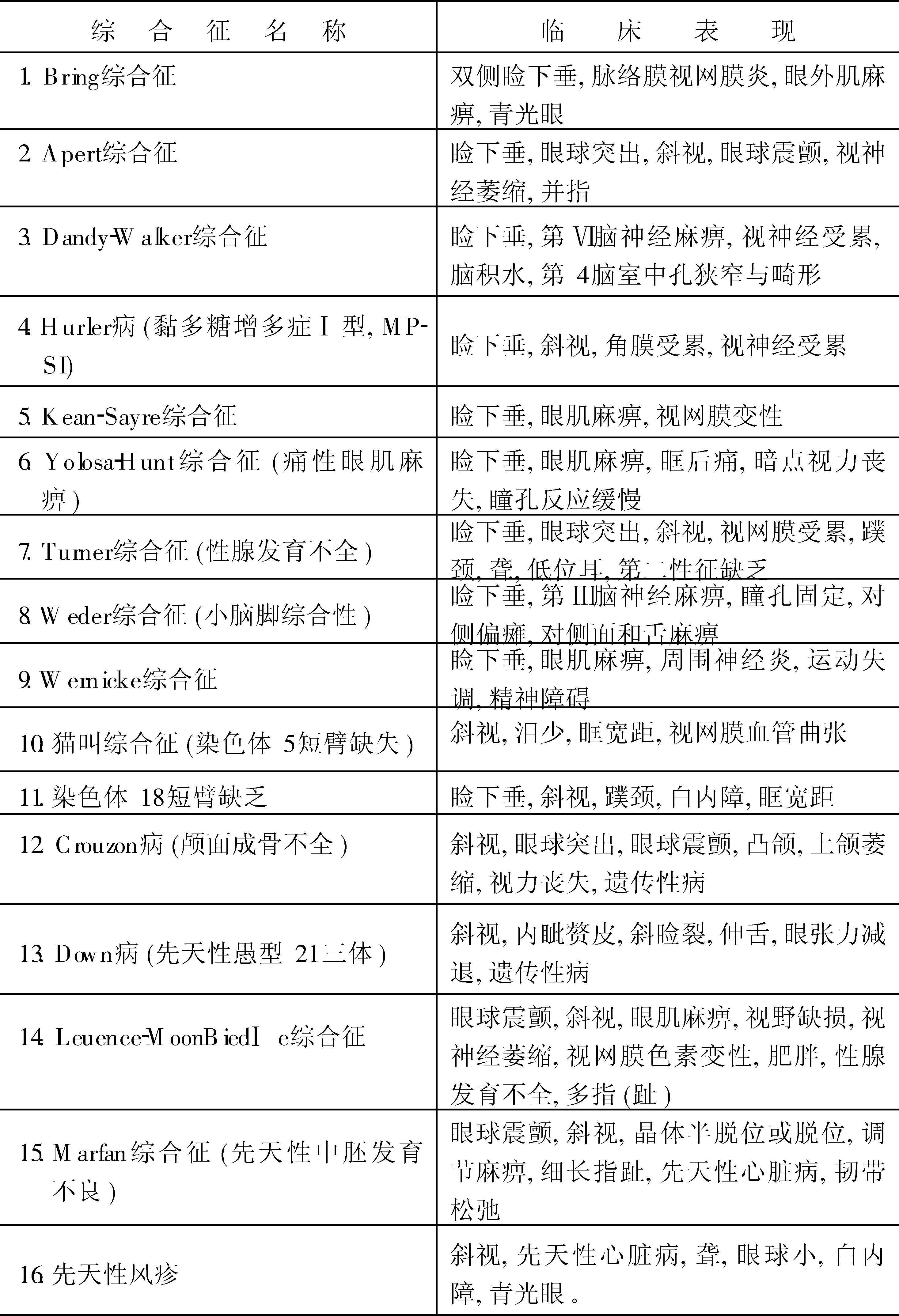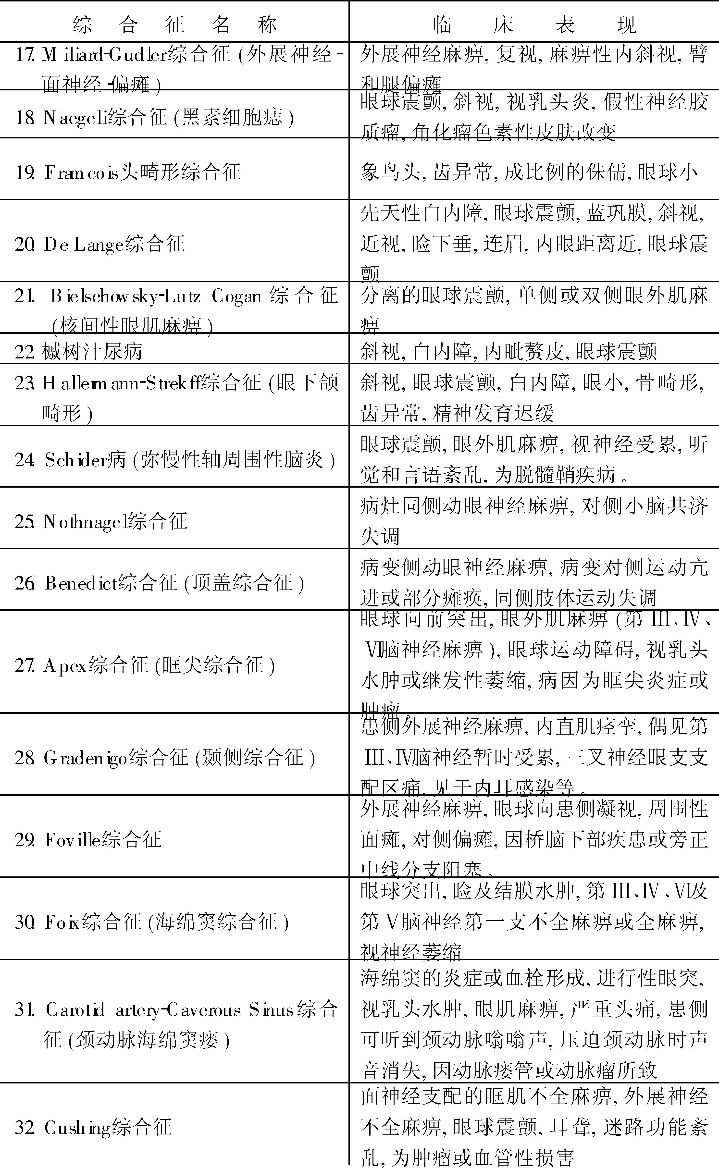 1水平、回旋混合性眼震,伴听力障碍时→末稍前庭系损害 2左右注视眼震(1)、(2)→振幅大、侧脑干损害(3)→后颅凹非特异性损害 3垂直性眼震(1)→小脑正中损害(2)→少见 4纯转性眼震→脑干下部损害(延髓) 5振子样眼震→先天性眼震 与斜视、眼球震颤有关的综合征 ☚ 倒错性眼球震颤 潜在性眼球震颤检查法 ☛ |