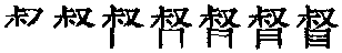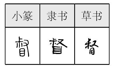 【提示】叔,左下是小,中间是一竖钩,位于字上时改为不带钩; 小的第二笔宋体是撇,楷体是撇点。目,中间两横宋体与两边相接,楷体与左边相接,与右边相离。 *督dū13画 目部 (1) 监管;指挥: ~察|~工|~学|~战|监~|~导员。 (2) 军帅或掌握监督权的官吏: 总~|都~。 督 ☚ 眷 睎 ☛ 督dū古代形声字。从目,叔声。声母舌尖音分化为翘舌音,同叔俶(chù,掉义)、赎读、谁堆例。察看义。引申为监督、监管义。如:督战|督促。 督★常◎常