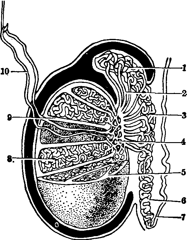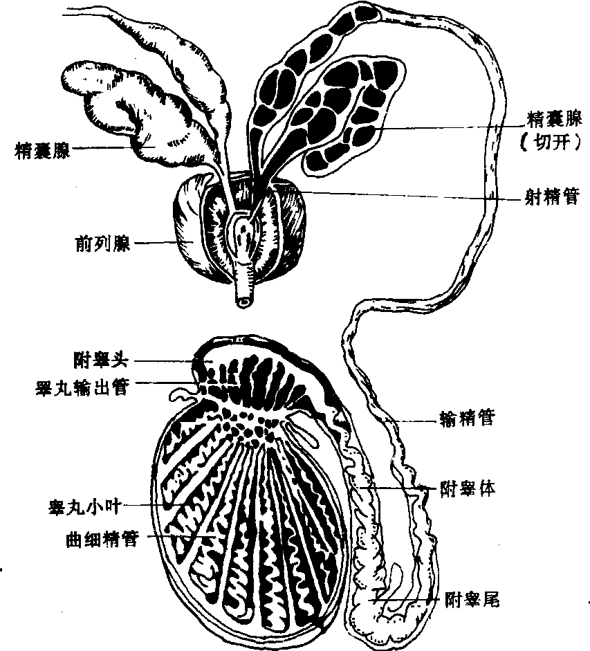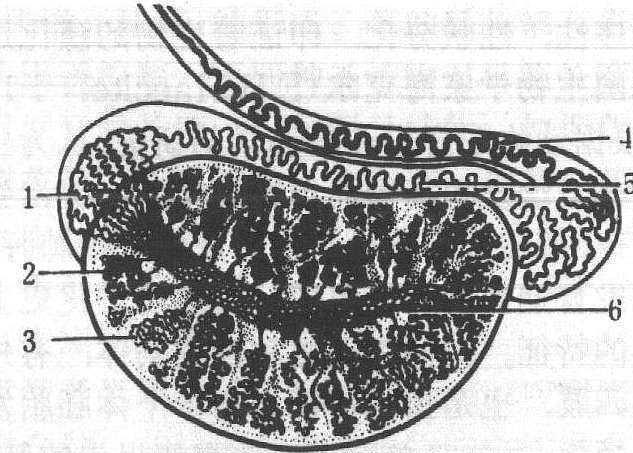 间质细胞 位于曲精细管之间的结缔组织中,常成群分布,数量因动物和年龄而异。马、猪较多,牛较少。胞体较大,圆形或多边形,核圆形,胞质中含有丰富的滑面内质网,高尔基复合体发达。能合成和分泌雄激素,主要是睾酮,释放入细胞周围的组织液中,一部分扩散入曲精细管,其余进入血液。 排出精子的导管 包括相连串的直精小管、睾丸网、输出小管、副睾管和输精管。前两者在睾丸内,输出小管和副睾管则形成副睾。直精细管系由曲精细管靠近睾丸纵隔时变直形成,短而细,管壁衬以单层立方或扁平上皮。直精小管入纵隔互相汇合成网,称睾丸网,管腔大而不规则,由单层立方或扁平上皮构成,其外围以纵隔的结缔组织。由睾丸网分出20条左右输出小管,入副睾头,其管腔不规则,管壁上皮为假复层柱状纤毛上皮,纤毛的煽动有助于精子向副睾管方向运动,上皮外包有薄层结缔组织和少量平滑肌纤维。副睾管,是一条管腔大的长而弯曲的细管,在副睾头内连输出小管,然后迂曲而形成副睾体和副睾尾。管壁也衬以假复层柱状纤毛上皮,腔面平整,纤毛不能运动,属静纤毛,由微绒毛束构成,有助于柱状细胞分泌物的排出以营养精子,使精子进一步成熟并贮存在副睾管的后段。输精管,在副睾尾与副睾管相连续,管壁粗厚,由粘膜、肌层和外膜构成,粘膜有纵行皱襞,因而内腔呈花瓣状; 上皮由假复层柱状纤毛上皮过渡到单层柱状上皮; 肌层发达,一般分内环形和外纵行肌层; 外膜主要为浆膜。 睾丸简称睾。亦作卵。是男性的主要生殖器,位于阴囊内,是产生精子和男性激素的器官。为足厥阴肝脉所过。《灵枢·经脉》: “足厥阴气绝则筋绝,厥阴者,肝脉也。脉弗荣则筋急,筋急则引舌与卵。”《格致余论·疝气论》:“疝气有甚者,睾丸连小腹急痛也。” 睾丸 睾丸系于精索下端,包裹在阴囊内,左右各一个,呈卵圆形,表面光滑,呈青白色,如鸽子蛋大小,一般左侧睾丸稍大于右侧,也比右侧稍低。睾丸是男性生殖器中最重要的器官,具有产生精子和分泌男性激素功能。睾丸内的精子对温度极为敏感,受冷刺激时,阴囊的肌肉就会收缩使睾丸提升,借助身体的热量提供温暖的环境;天气炎热时,阴囊变得松驰,使睾丸偏离身体,以便散发阴囊的热量,保证睾丸正常功能。 ☚ 性器官 输精管 ☛ 睾丸testis又称精巢。动物产生精子和分泌雄性激素的器官。低等脊椎动物有雌雄同体现象,睾丸和卵巢同时存在一个动物体内。高等脊椎动物是雌雄异体,只有雄性动物才有睾丸。一般位于体腔背侧壁,肾的内侧。哺乳动物的单孔目、食虫目、蹄兔目、贫齿目、海牛目、鲸目、长鼻目中的许多种类的睾丸终身位于体腔内。而有蹄类、有袋类、食肉类、灵长类的睾丸则下降至阴囊内。另外,骆驼、蝙蝠、大部分啮齿类和类人猿的睾丸只有在生殖时下降阴囊,平时缩回体腔。睾丸虽然形态各异,但基本结构都相似。表层有固有鞘膜,里层有结缔组织性白膜,并向内伸展分隔实质,形成许多睾丸小叶。每个小叶有曲精细管盘曲而成,出小叶时变直为直精细管,在中轴处吻合成睾丸网,并合并形成10余条睾丸输出管离开睾丸头而进入副睾。曲细精管由生精上皮及支持细胞构成。生精上皮包括精原细胞、初级精母细胞、次级精母细胞、精子细胞和精子。在曲精细胞间的结缔组织中,有间质细胞,能合成和分泌雄激素。 睾丸和附睾结构 1.白膜 2. 睾丸间隔 3. 曲细精管 4. 睾丸网 5. 睾丸纵隔 6. 输出管 7.附睾管 8. 输精管 9. 睾丸小叶 10. 直细精管 睾丸位于阴囊内,左右各一。从睾丸纵隔发出许多放射状的睾丸小隔,将睾丸实质分成200多个锥体形的睾丸小叶。从睾丸网发出12~15条睾丸输出小管,经睾丸后缘上部进入附睾头。 睾丸 睾丸gaowan男性生殖腺,位于阴囊内,左右各一。睾丸的形状呈扁椭圆形,后缘与附睾相连。表面包有一层致密的结缔组织膜称为睾丸白膜。白膜在睾丸后缘增厚,并伸入睾丸实质,将睾丸实质分隔成许多小叶,每一小叶均由曲细精管组成。曲细精管在睾丸后上部汇合成睾丸网,由网发出睾丸输出小管,穿出睾丸后缘,进入附睾头。睾丸白膜的外面被覆有睾丸固有鞘膜,又分脏、壁两层。两层间是鞘膜腔,内含少量浆液。功能有二:一是产生精子,每次射出的精液中有精子3~6亿个; 二是分泌雄性激素。所以,睾丸既属于生殖系统,又属于内分泌系统。 ☚ 女性生殖系统 卵巢 ☛ 睾丸 睾丸gaowan男性的生殖腺。左右各一,卵圆形,位于阴囊内,与附睾、输精管相连。睾丸长3~4厘米,每个重10~15克。幼年期睾丸较小。在性成熟之前,睾丸发育缓慢,至性成熟期生长迅速,开始产生精子,有了生殖能力;老年人则渐趋萎缩,性机能也逐渐减退。睾丸(见图)内有许多睾丸小叶,每一小叶由3~4根曲细精管组成。曲细精管汇集后通向附睾和输精管。曲细精管是精子的发源地。男子到青春期后,曲细精管内的生殖细胞逐渐发育成熟而形成精子。在曲细精管之间的间质细胞有分泌雄激素的功能,雄激素能促进男性附属生殖器官的发育并维持其正常活动。此外男子身体的特征,如发达的肌肉、胡须、阴毛分布的类型、男性的声音等,亦与男性激素有关。, 男性内生殖器 ☚ 生殖 前列腺 ☛ 睾丸testicle系男性生殖腺。左、右各一,位于阴囊内。睾丸是微扁的椭圆体,表面光滑,分内、外两面,前、后两缘及上、下两端。前缘游离、后缘附有系膜,后缘上