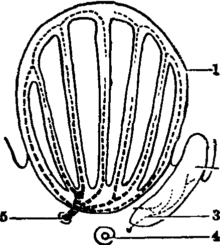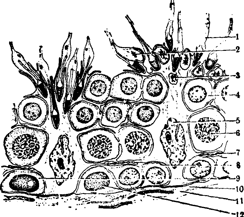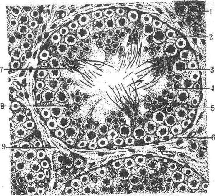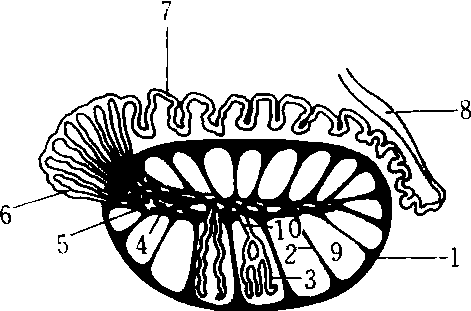 曲精细管 长而弯曲的上皮性管道,长约50~80cm,直径约100~200μm,末端形成襻或盲管,起于小叶边缘,迂曲分布小叶内。横断面上有明显的基膜,上有两类形态结构和功能各异的细胞(图2)。一类是支持细胞,又称足细胞或塞托利氏细胞,呈极不规则的高柱状或锥状,单层排列于基膜上,顶端伸入管腔,侧面和腔面形成许多凹陷供各级生精细胞附着;细胞核大,椭圆或三角形,长轴与管腔垂直,核膜、核仁明显; 胞质中含有丰富的线粒体、内质网、微丝、微管等细胞器,以及糖原和类脂。支持细胞是一种多功能的细胞,它对各级生精细胞具有支持、保护和营养作用,为它们的分化和发育提供适宜的微环境; 参与各级生精细胞向腔面推移和精子释放的作用; 能吞噬退化的精子和精子在变形过程中丢失的胞质残余体;向曲精小管内分泌液体,有助于精子的运送; 它还能合成雄激素结合蛋白、类固醇激素和分泌抑制素等。相邻支持细胞的近基部胞膜形成紧密连接(见细胞连接),它与曲精细管的基膜、睾丸间质的结缔组织、血管内皮及其基膜共同构成血睾屏障,能阻止血液内的大分子异物(如细菌等)进入曲精细管和维持腔内较高的雄激素浓度,有利于生精细胞的发育。另一类是生精细胞,包括精原细胞、初级精母细胞、次级精母细胞、精子细胞和精子。精原细胞是产生精子的干细胞,圆形或椭圆形,位于基膜上; 初级精母细胞为常处于分裂和生长期的生精细胞,位于精原细胞内侧,圆形,细胞较大,核大而圆,有明显的分裂相。次级精母细胞由初级精母细胞进行第一次成熟分裂而来,在初级精母细胞内侧,比前者稍小,其存在时间不长,即进行第二次成熟分裂形成精子细胞。精子细胞为圆形小细胞,不再进行分裂,位置靠近管腔,经过一系列复杂变形,形成蝌蚪状的精子离开支持细胞进入管腔。从精原细胞至精子所需的发育时间,依动物而异。绵羊约49~50天,牛约60天,猪约44~45天,马约50天。在整个曲精细管内,各节段的精子发生不是同步的,并有一定周期性,但从一个精原细胞分裂来的各级生精细胞,分裂时细胞质并不完全分开,互相有少量细胞质相连,此处可作为细胞间互通信息的渠道,使由一个精原细胞发育来的子细胞同步发育、成熟和释放。 图 2 曲精细管横切面