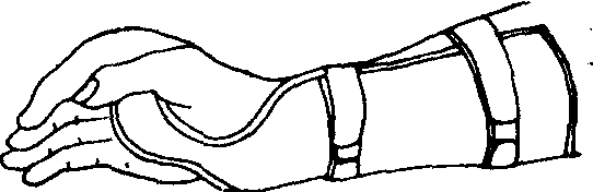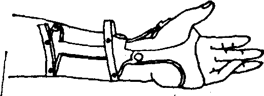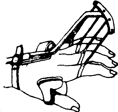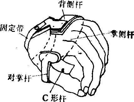 腕部矫形器 (1) 固定性腕部矫形器 ❶护腕: 用皮革、金属条或塑料板制成,可将腕关节固定于功能位(背伸20度—30度,尺侧偏10度)。适用于腕下垂和腕关节炎症(图5)。 ❷长对掌支具,系在基部对掌支具的基础上增加了前臂杆和近侧、远侧十字杆。其功能除使拇指保持在对掌位外,还增加了对腕部和前臂的固定作用。 (2) 功能性腕部矫形器系在长对掌支具的基础上增设一个腕关节铰链和橡筋助伸带。适用于伸腕肌麻痹,但屈腕和手部功能完好的患者。腕关节内收外展支具: 是一种用以纠正手部偏斜的矫形器(图6)。由前臂杆、手掌杆和橡筋组成,前臂杆与手掌杆之间形成一个能自由活动的交叠式铰链。通过橡筋的张力矫正手部的偏斜,橡筋则位于尺侧,向尺侧偏斜,橡筋则位于桡侧。