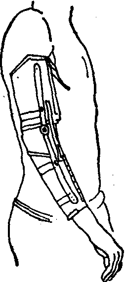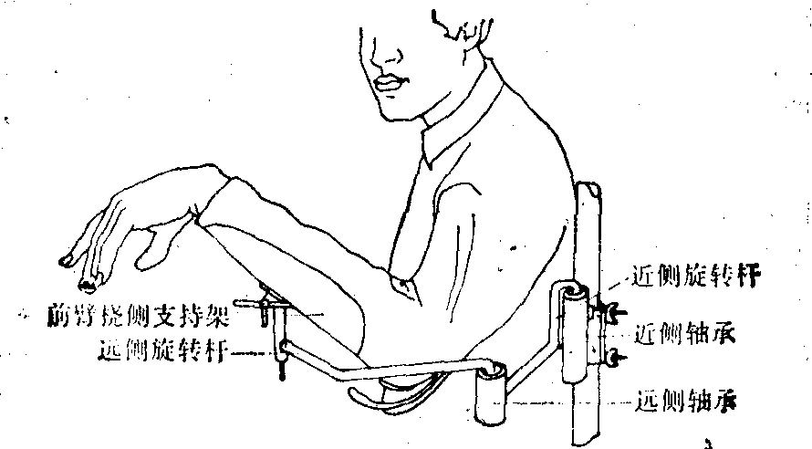 图8 轴承式前臂矫形器 展支具(又称飞机架),可使肩关节固定在外展90° 的位置,同时允许肘关节屈曲约90°。此时,上肢的重量通过骨盆支座承受在髂嵴上方,并用两根皮带将矫形器固定在躯于侧。这种矫形器适合肩部手术后或臂丛神经修补术后短期固定之用(图9)。 ❷翼状肩支具,其作用是对肩胛骨施加一定的压力,限制其向后移动。适用于前锯肌麻痹引起的翼状肩胛畸形以辅助恢复肩关节外展功能。