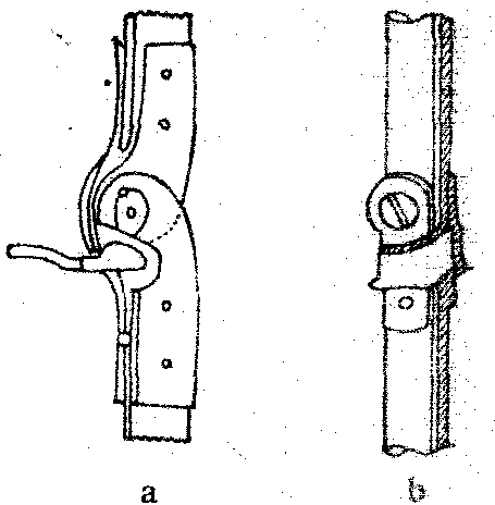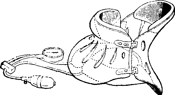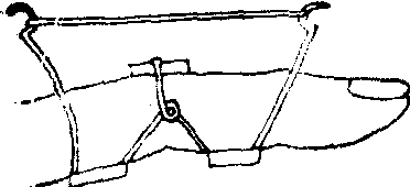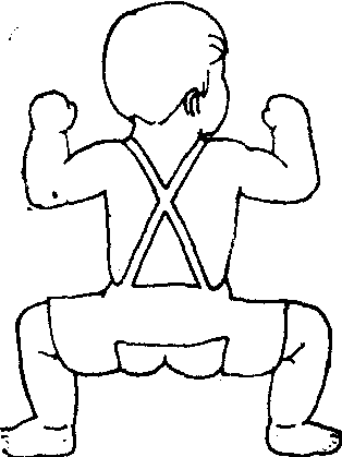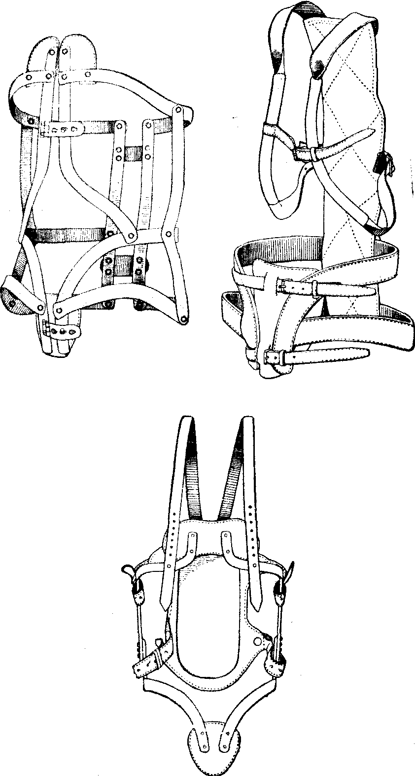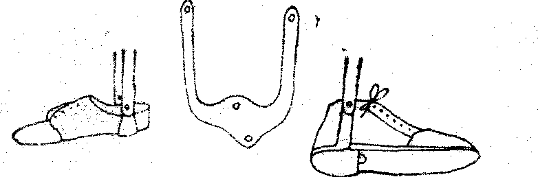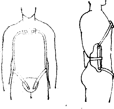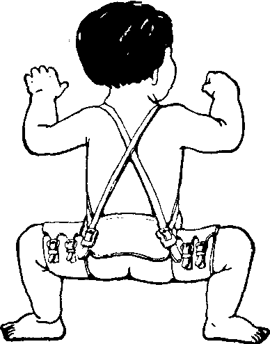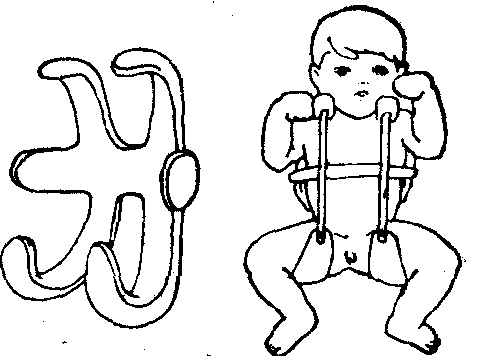 矫正性下肢矫形器 (1)马蹄内翻足矫正支具: 又称丹尼斯-勃朗夹板,适合一周岁以下患先天性马蹄内翻足的婴儿使用。支具由两个“L”形足板和连结条组成,使用时先将双足固定在足板上,再将踝部固定在足板的直立部分,然后将两侧足板固定在连接条的两端。通过螺丝可调节足板的外旋角度,通过弯曲连接条还能使矫正力加大,此外病儿下肢主动交替屈伸运动也有助于增加矫正作用。 (2) 髋脱位外展支具: 由金属板、大腿皮套和背带组成,可使髋关节固定在屈曲外展位。供三岁以下先天性髋脱位的幼儿手法复位和石膏固定后使用(图16)。另有一种用塑料板制作的髋脱位外展支具,结构简单,可供年龄较小的患儿使用(图17)。
