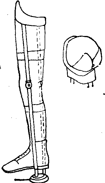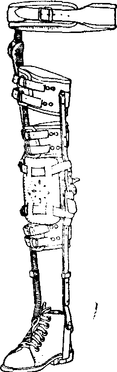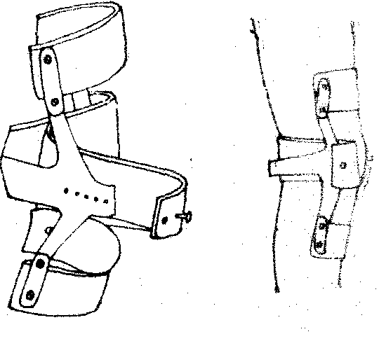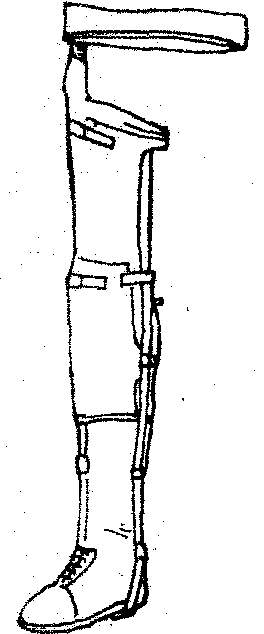步行的装置,通常采用双侧髋大腿矫形器与四杆式腰骶椎矫形器连接的形式。髋关节铰链、膝关节铰链均采用带锁式,踝关节铰链需限制在90°或使用固定式。使用截瘫支具时应注意安全,要避免局部过分受压,训练时应有专人指导和保护,同时也要加强上肢、腰背部和腹部肌肉的锻炼。截肢支具适用于第10胸椎以下的低位截瘫患者,对高位截瘫效果不佳。 (5) 膝关节矫形器(KO): 对于需要限制膝关节运动而不需限制踝、足运动者可使用膝关节矫形器,常用的有 ❶护膝架: 相当于大腿矫形器的中间部分,其固定范围一般为膝关节上、下各20cm。主要用于限制膝关节的异常运动如膝反屈,膝侧韧带松弛等。 ❷膝反屈支具:如瑞典式膝反屈矫形器(图14),由金属支架、腘窝垫、膝上和膝下压带组成,利用三点矫正原理将膝关节限制在伸直位。这种支具不影响膝关节屈曲,能方便地坐下,适用于各种原因引起的膝反屈。 (6) 髋关节矫形器(HO): 固定范围包括整个骨盆和大腿部分,由金属支条、皮革或塑料板制成。这种矫形器常用来防止因脑性瘫痪引起内收肌痉挛而出现的髋关节内收,也可用于全髋关节换置后的恢复期以保持髋关节的正确位置。 免荷性下肢矫形器 当需要减少或免除下肢骨胳对体重的负荷时,可使用免荷性下肢矫形器,常用的有两种: (1)髌韧带承重(PTB)矫形器: 用以减少或免除胫骨中段以下,包括踝关节和足部的体重负荷。其结构与常规型小腿矫形器相似,只是增加一个髌韧带承重托,承重托用塑料板材通过热成形法制作,其形状与PTB小腿假肢相同。穿戴后,体重即由髌韧带和胫骨上端传至承重托,然后通过两侧金属支条传至皮鞋上,故只有一小部分体重经过胫骨远端和踝关节。当患者需要完全免除承重时,可将患肢悬空,矫形器下端通过一个“马蹬”与地面接触,此时需将健肢垫高以便于行走。 (2) 坐骨承重矫形器: 适用于需要减免髋关节或股骨承受体重的患者使用,其结构类似于大腿矫形器,不同处为使用了一个四边形坐骨支座用塑料制成,其设计原理和结构特点均与大腿假肢四边形接受腔的上部相同。需要全部免除承重时也需使用“马蹬”(图15)。