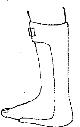 下肢矫形器 下肢矫形器可能用于以下目的: ❶固定病变关节。 ❷预防或矫正畸形。 ❸代偿失去的肌肉功能。 ❹改善步态。 ❺减免肢体承重。 ❻促进骨折愈合和早期功能恢复。 ❼巩固手术疗效。 ❽用于因年龄过小暂不宜手术的患者。 ❾作为手术前治疗措施。 ❿增加美观。 下肢矫形器(不包括塑料矫形器)的基本结构包括金属支条,关节与关节锁、足底蹬板和固定装置。足底蹬板可与矫形鞋或足套相连接,使用足套时可更换不同的鞋(图10)。金属部件采用预制件,这样可缩短制作时间并使成本降低。近年来,下肢矫形器除关节和足底蹬板外,只要对强度无特殊要求,已广泛采用轻金属(铝合金)支条,其重量较过去的钢制支条明显减轻。 图10 足底蹬板的连接方式 下肢矫形器按其功能可分为限制性下肢矫形器、免荷性下肢矫形器和矫正性下肢矫形器三类。 限制性下肢矫形器 (1)小腿矫形器: 简称AFO,其固定范围为小腿上部到足底。分为 ❶常规型小腿矫形器: 由两侧金属支条、踝关节铰链、足底蹬板、矫形鞋(或足套)和固定装置组成。踝关节铰链可根据病情需要设计成: 限制跖屈、帮助背屈式,适用于足下垂患者。限制背屈、帮助跖屈式,适用于小腿三头肌麻痹。自由运动式,适用于踝关节侧向不稳定如足内、外翻等。固定式踝关节,适用于连枷关节。在装配过程中,要求踝关节铰链的轴心与解剖踝关节轴心一致,即相当于内踝下缘至外踝中心的连线。如病情需要,小腿矫形器还可增设牵引簧或丁字带。 ❷塑料小腿矫形器(图11): 系用热塑性塑料板材,按照石膏模型热成形或抽真空成形制成,用尼龙搭扣固定在小腿上部,需穿入鞋内使用。塑料小腿矫形器较常规型具有重量轻、美观、穿着时无响声。与肢体适合程度好等优点,但对石膏模型的制取和修整技术要求较高。此外还存在透气性较差以及制成后修改较为困难的问题。