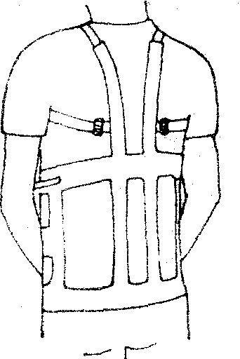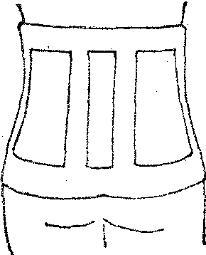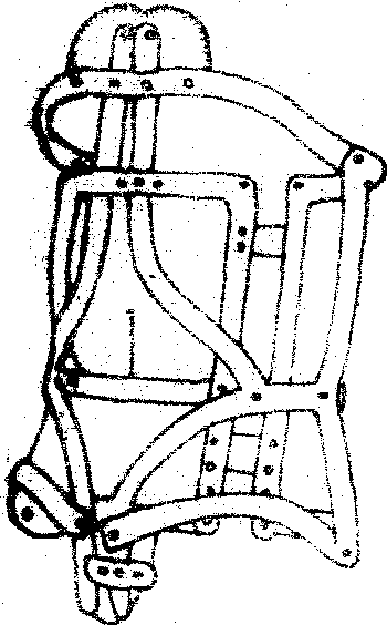 胸腰骶椎矫形器 过去习惯称为胸腰椎矫形器,常用的品种有: ❶蝶式胸腰骶椎矫形器: 由两根背后条,两根侧条与骨盆托、胸托相连构成支架,再通过腋带和软性腹托将矫形器固定在腰背部(图21)。这种矫形器利用了两组三点矫正力,第一组为背后条、腋带和骨盆托,