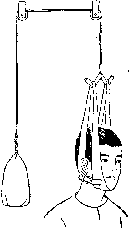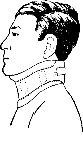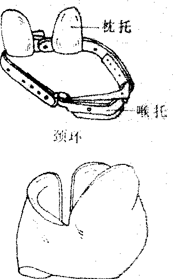(3) 膝内外翻矫正支具: 主要用于矫正小儿佝偻病引起的膝内、外翻畸形。由单侧钢支条、带锁的膝关节铰链、矫形鞋和牵引带组成。膝内翻将钢条置于肢体内侧,牵引带置于外侧,利用牵引带的拉力矫正畸形。膝外翻则反向安装。 脊柱矫形器 脊柱矫形器主要用于减轻局部疼痛,保护病变部位免受进一步损伤,支持麻痹的肌肉和预防、矫正畸形。其作用机制有三个方面: ❶通过对躯干的支持(包括软性支持如各种腹托、围腰等和硬性支持如金属板、条和塑料板等) 增加对腹内脏器的压力,从而减少脊柱及其四周韧带、肌肉的纵向负荷。 ❷通过对躯干运动的限制,一方面是各种软性和硬性脊柱矫形器均可在三点作用力的影响下限制躯干的运动。另一方面,作为对矫形器这个外来刺激的反应而使躯干运动减少。 ❸通过对脊柱对线的再调整,一方面依靠三点力的矫正作用,另一方面是由于受到矫形器刺激的肌肉从不舒适的压力点“退让”而产生的矫正力。 脊柱矫形器除具有肯定的治疗作用外,如果使用不当,特别是在长期穿戴的情况下,也可能会出现某些副作用。常见的有肌肉萎缩、肌肉韧带紧张甚至挛缩等。预防的方法是穿戴矫形器应在医生指导和观察下进行。此外还应注意及早配合体育锻炼。 按照其功能,脊柱矫形器可分成固定性脊柱矫形器和矫正性脊柱矫形器两大类。 固定性脊柱矫形器 颈椎矫形器 ❶围领: 用塑料或皮革制成,其作用机制为通过感觉反馈提示病人限制头颈部活动。围领又可分为可调式和不可调式,可调式围领能调节颈椎的屈伸度以适应不同患者的需要。其适用范围为颈椎病和其它较轻的颈椎疾患(图18)。 ❷颈椎支架: 包括塑料板或铝板制成的下颌托、枕托、胸托、背托以及前后金属支条和固定皮带。对颈椎有一定的固定和减荷作用,适用于颈椎病,外伤或其它原因所致的颈椎不稳定等。 ❸充气式颈托: 用前后两块塑料板按照模型制成,内设一个充气垫,患者自行充气后可将颈部上托,减轻颈椎的负荷,其适用范围与颈椎支架相同(图19)。 ❹颈椎牵引带: 适合于颈椎病和颈椎间盘脱出患者作颈椎牵引用,以缓解颈部肌肉痉挛,减轻神经压迫(图20)。
