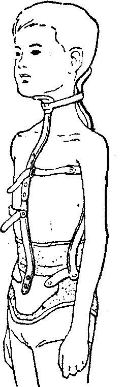 (2) 脊柱侧凸矫形器: 主要用于治疗发育年龄各种原因引起的中度脊柱侧凸,以矫正畸形或预防畸形发展。常用的有两种。 ❶三点力式侧凸矫形器: 以金属条或塑料制成的脊柱矫形器为基础,增加了矫正托或矫正带,适用于原发性曲线位于胸腰段的患者。 ❷Milwaukee支具:由塑料或皮革骨盆座、三根直立金属条、颈环、喉托、枕托和压力垫(包括胸垫、腰垫、腋下带或肩环)组成(图25)。胸部压力垫为主要侧方矫正力,置于凸侧,其相对应的力上方由颈环、对侧腋下带或肩环提供,下方则由支具还具有纵向的牵引作用,试验证明穿戴支具仰卧时的牵引力为站立时的2.5倍,这是由于支具后支柱由桡曲位伸展所致。因此要求患者于夜间就寝时继续穿戴支具。骨盆座需按石膏模型制作,为了确保其基座的作用,必须掌握正确的修型技术,完成后的骨盆座应保持与骨盆紧密适合,无上下窜动或旋转,其上部深入腰际但不应压迫髂嵴,下缘前面较短,使坐下时不受限制,后面较长,以坐下时距椅面2.5cm为适当。支具制作过程中要经过仔细的试穿和调整,特别注意压力垫的位置和松紧度。在患者使用的初期仍需经常观察和作必要的调整,三个月内应每月检查一次,以后可三个月检查一次。Milwaukee支具要求每日24小时持续穿戴,淋浴和体育锻炼时可临时取下。一般需穿戴至骨胳生长停止时,在终止穿戴前应有一过渡阶段。Milwaukee支具适用于胸腰椎原发性曲线按Cobb法测定的角度为20°~50°的患者。 ☚ 假耳(耳郭) 矫形鞋 ☛ 矫形器 矫形器矫形器是用于人体某些部位以预防、矫正畸形和治疗骨胳、关节、神经、肌肉疾病及补偿其功能的器械,包括支架、夹板等。对矫形器的基本要求,应是治疗作用好,轻便耐用,不影响固定范围以外的关节功能,不引起压痛,透气性好,穿戴不引人注目。其中尤以要求治疗作用好为主,包括: 图1 带髋关节铰链的大腿支架 ![]() 图2 髋脱位外展支架 脊柱矫形器 是治疗脊柱疾病和损伤,矫正脊柱畸形的器械。常用的有以下四类。 颈椎矫形器 ❶围领: 用塑料或皮革制成(图3)。适用于小儿环枢椎半脱位复位后及成人颈椎病等。 ❷颈椎支架: 由塑料或铝板制成的下颌托、枕托、胸托、背托与金属支条、连接皮带构成。对颈椎有一定的固定和减荷作用。适用于颈椎病或外伤性、先天性颈椎不稳定。 ❸颈椎牵引带: 适用于颈椎病和颈椎间盘脱出病人作颈椎牵引用,以缓解颈部肌肉痉挛,减轻神经压迫(图4)。 ❹充气式颈椎支架: 在颈椎支架下方有气囊,充气后将头向上托起。病人可以自行充气、调节力量,也便于携带。适用于颈椎病(图5)。 ![]() 图3 塑料围领 图4 颈椎牵引带 ![]() 图5 充气式颈椎支架 胸腰椎矫形器 ❶铝质胸腰椎支架(铝背心): 用外包塑料层的铝合金条,根据三点固定的原理制成。前面两个固定点分别位于上胸骨柄部、耻骨联合,后面固定点位于腰背部。其作用是将脊柱固定于伸直位,限制前屈、侧屈和旋转运动。适用于辅助治疗下胸椎和腰椎的骨折、结核、类风湿性脊柱炎等。 ❷蝶式支架(Taylor brace):设有双侧肩带,可将上胸部与两肩部向背侧牵拉,固定脊柱于伸直位。适用于静止的脊柱结核、强直性脊柱炎,防止畸形发展和缓解陈旧性脊椎骨折引起的腰背痛。 ❸胸腰椎伸展支架: 适用于胸腰段脊椎压缩性骨折、青年性脊柱后凸、老年驼背、轻度强直性脊柱炎,以缓解症状与防止畸形发展(图6)。 骨盆带与围腰 ❶骨盆带: 用布或皮革制成。环匝在髂嵴与股骨大转子之间。适用于耻骨联合分离及骶髂关节炎的病人。 ❷围腰: 用布或皮革制成。用以限制腰部和腰骶关节活动,辅助治疗腰椎间盘脱出、腰部肌肉、韧带、关节劳损等下腰痛疾病。 脊柱侧凸矫形支架 主要用于治疗发育年龄,各种原因引起的中度脊柱侧凸,以矫正畸形或预防畸形发展。根据结构分为两类。 ❶三点力式侧凸矫形支架: 以金属条或塑料制成的脊柱矫形器为基础,增加了矫正托或矫正带,适用于原发性曲线位于脊柱胸腰段的病人。 ❷Milwaukee支架:是一种用皮革或塑料板按石膏模型制成的矫形支架。由骨盆座、金属条、下颌托和枕托构成。利用金属条的支撑力量来矫正侧凸畸形。在凸侧可加用矫正托或矫正带。由于儿童长期使用,下颌托可引起牙齿畸形,近年来多用喉托代替。Milwaukee矫形支架适用于胸腰椎原发性曲线按Cobb法测定的角度为20°~50°的病人(图7)。 图6 胸腰椎伸展支架 ![]() 图7 Milwaukee支架 ☚ 大腿假肢 矫形鞋 ☛ |