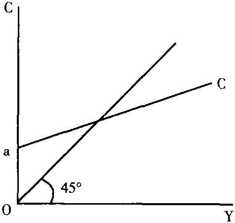还可以用附图来表示短期消费函数。图中横轴代表收入,纵轴代表消费。45°线是收支相抵线,线上任何一点都表示收入等于消费支出,aC则是短期消费函数曲线。根据对短期消费时间序列资料的研究,短期消费函数的特点是:第一,在短期中,消费可能大于、等于或小于收入,当消费大于收入时有负储蓄,当消费小于收入时有储蓄。第二,在一般情况下,短期中平均消费倾向与边际消费倾向仍然小于1,但边际消费倾向小于平均消费倾向。凯恩斯的绝对收入假说是对短期消费函数的解释。参见“消费函数”、“绝对收入假说”。