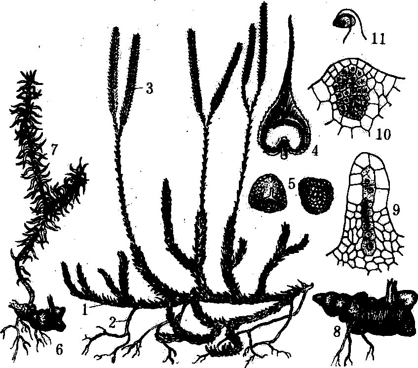 释义 | 石松纲Lycopsida茎细长中实具小型叶的维管孢子植物。出现于下盆泥纪,最早的代表为一年生的草本。到密西西比亚和宾夕法尼亚时期,石松类占优势,有的为高达35m的大乔木,是沼泽森林的重要组分,后来成为较大的泥炭沉积。至二叠纪,因气候较寒冷而干旱,这些巨大的石松已绝迹。今天存活的石松都是小型的,包括石松属(Lycopodium)、卷柏属(Sellaginella)。全球石松属约400种,卷柏属约700种。多数分布于热带地区,生于荫蔽林地的酸性土壤上,或附生。中国石松属约20种,卷柏属约50种。 石 松 1~5. 孢子体(1.茎、叶; 2.根; 3.孢子叶穗; 4.孢子叶和孢子囊; 5.孢子); 6. 配子体; 7. 幼孢子体; 8. 配子体; 9. 颈卵器; 10. 精子器; 11. 精子 石松纲Lycopsida小型叶蕨类植物中的一个大类群。孢子体通常有直立或横走的主轴,以一定的间隔向上生出侧枝,具原生中柱,木质部为外始式。叶小型,钻形、鳞片形或卵圆形,有中脉而无侧脉,螺旋排列或四行并列。孢子叶散生或组成孢子叶穗,孢子囊单生于孢子叶的叶腋,孢子同形或异形。本纲包括石杉科(Huperziaceae)、石松科(Lycopodiaceae)和卷柏科(Selaginellaceae),共约900余种,广泛分布于世界各地,而以热带和亚热带为中心。中国有100余种,分布于全国各省区。生于林下、荒山草地或岩缝中。有的是气候或土壤指示植物,有的可供药用、工业原料或观赏用。 |