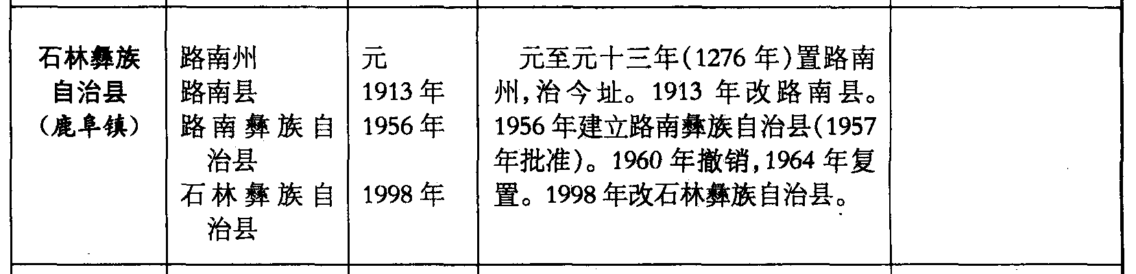 石林彝族自治县(鹿阜镇)路南州路南县路南彝族自治县石林彝族自治县元1913年1956年1998年元至元十三年(1276年)置路南州,治今址。1913年改路南县。1956年建立路南彝族自治县(1957年批准)。1960年撤销,1964年复置。1998年改石林彝族自治县。