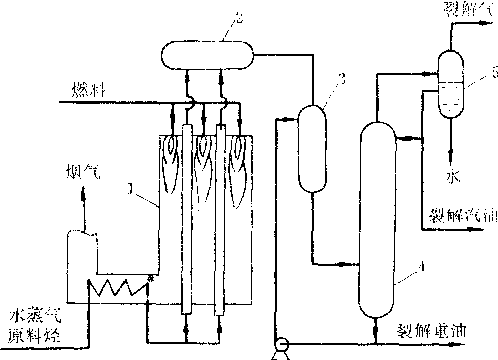 烯烃裂解 较大的烯烃分子裂解为两个小烯烃分子,其通式为 Cm+nH2m+2n→CmH2m+CnH2n-Q 原油中很少有烯烃存在,发生裂解的烯烃 一般都是由烷烃裂解生成的,所以烯烃裂解是 二次反应。环烷烃裂解 环烷烃裂解可以有多种方式,如环己烷可裂解为 除上述主要的有益反应外,还会发生有害反应,主要是生炭反应 为了在极短时间内供给大量反应热,反应宜在管式炉内进行。此外,裂解反应使体积增大,减压操作对正反应有利,但实际生产中,为防止空气漏入系统引起爆炸,操作压力略高于大气压,同时加入水蒸气作为稀释剂以降低反应物料的分压。如图所示,燃料油(或燃料气)由导管喷入炉内燃烧把反应管加热至900℃左右,原料烃和水蒸气预热后从反应管内快速通过(950℃时,停留时间仅为0.01~0.02s)发生裂解反应。反应后的物料导入急冷换热器将温度迅速降至550℃以下使反应停止,再 导入油急冷器与来自精馏塔底的重油混合进一步降温后导入精馏塔进行蒸馏分离。塔顶馏出物经油水分离器进行气液分离和油水分离。主产物裂解气由分离器上部导出送去净化和分离,中部导出的裂解汽油一部分回流,一部分送去提取芳烃,塔底导出的裂解重油 一部分导入油急冷器用做急冷油,一部分用做裂解炉燃料或返回反应管做裂解原料。裂解主产物裂解气是多组分混合物,要得到单一的高纯度产品,必须进行进 一步分离和净化。 裂解生产流程 裂解气的分离有多种方法,目前多采用深冷法,即在-100℃左右加压至约3MPa,将裂解气中氢和甲烷以外的其他组分全部冷凝成液体,再利用各种烃沸点的不同,用精馏的方法逐 一分离,所得产品主要为氢、甲烷、乙烯、丙烯和丁烯。 ☚ 石油的催化重整 石油化工产品 ☛ |