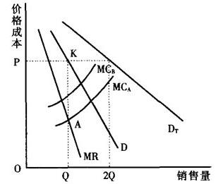 释义 | 低成本价格领导 价格领导的一种形式。 这样的领导企业在竞争者中有明显的成本优势,连续充当著价格领导角色,对其他企业有一定支配作用。如果发生价格战,其他企业将遭到比低成本企业更大的损失和更易破产倒闭。 所以其他企业往往只好服从低成本企业的价格调整。 这类价格领导有2种情况: 当产品价格由低成本企业按最大化利润原则决定后,其他企业必须照此价格出售。因为低于或高于这个价格都不能保证最大利润。 下图可以说明这种情况。2个企业(A和B)平分市场份额,有著相同的需求曲线(D)和边际收益曲线(MR),差别在于A企业的成本较低。 低成本企业在A点(MR=MCA)定价,相应的价格和销量为P和Q。此时B企业面临著曲折的需求曲线PKD,它若高于P定价,不但会丧失顾客,而且MR>MC,不可能得到最大利润;若低于P定价,其他企业会随之降价,且MC>MR,也得不到最大利润,因此B企业必须按P价格出售Q产量。 跟随者企业中产品质高(成本也高)的定价稍高;产品较次(成本仍高于领导企业)的定价稍低。结果,领导企业和跟随者企业的价格差别在价格变动前后依然存在,只是整个价格结构向上(或向下)作了调整。 |