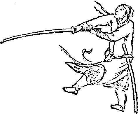 传统刀术动作。明程宗猷《耕余剩技》“单刀说”篇载:“先立低看势,彼枪扎左脚,用低插一提,彼枪起扎面,将刀背勾开枪,斜进右脚砍杀。”
