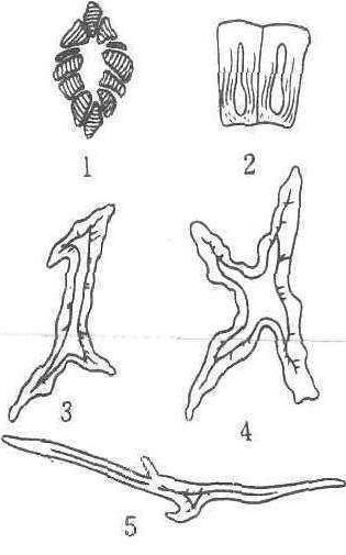 石细胞 1. 短细胞 2. 大石细胞 3. 骨状石细胞 4. 星状石细胞 5. 毛状石细胞 石细胞一种壁强烈增厚的厚壁细胞,形状多样,木质化的次生壁上有许多单纹孔,分散或成群地分布在茎、叶、果实和种子中,起机械支持作用。 |
