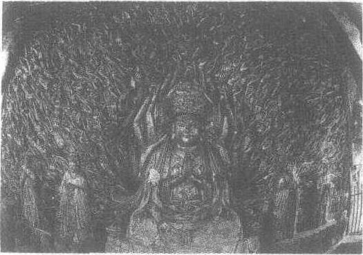释义 | 石雕千手观音像 石雕千手观音像南宋。崖面高7.2米,宽12.5米,像高3米。四川省大足县宝顶山第8号摩崖。为六观音之一,又名千手千眼观音。因发誓要利益一切众生,于是长出千手千眼,巨手遍施,慧眼遍照。此千手观音结跏趺坐于莲台,头戴花冠,双手合十,表情肃穆。雕像的难能可贵在于千手和千眼不仅仅是象征,而是如实地雕出1007只手与眼。而寺院的一般造型是两眼两手下,左右各具20手,手中各有一眼。此观音手持各种法器,展现出千姿百态的手形。千手宛如天生,组合在一起具有孔雀开屏般的艺术效果。构图壮丽,金碧辉煌,有秀丽而宏伟的艺术气氛。 ☚ 石雕养鸡女像 宝顶圆觉洞 ☛ |