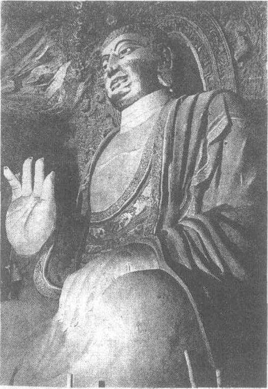 唐。通座高2400厘米。陕西省彬县大佛寺造像。佛挽螺髻,颈、胸袒露,身着饰以滚边花纹的袈裟,右手五指叉开,置胸前,左手抚膝,结跏趺坐于台座上。其面容丰腴,双唇紧抿,炯炯有神的眼中透露着睿智的光,眉间饰白毫相。背光饰满蔓草,火焰,化佛,飞天等纹样。佛龛有唐贞观四年(公元630年)的题记。佛像造型魁武,泥塑风格突出,虽历经宋、明、清各代多次修饰,仍不失其伟岸的雄姿。彬县大佛寺位于彬县西十公里泾水岸边的山崖上,是在古代由长安通往甘肃敦煌、新疆一带“丝绸之路”的通道上。